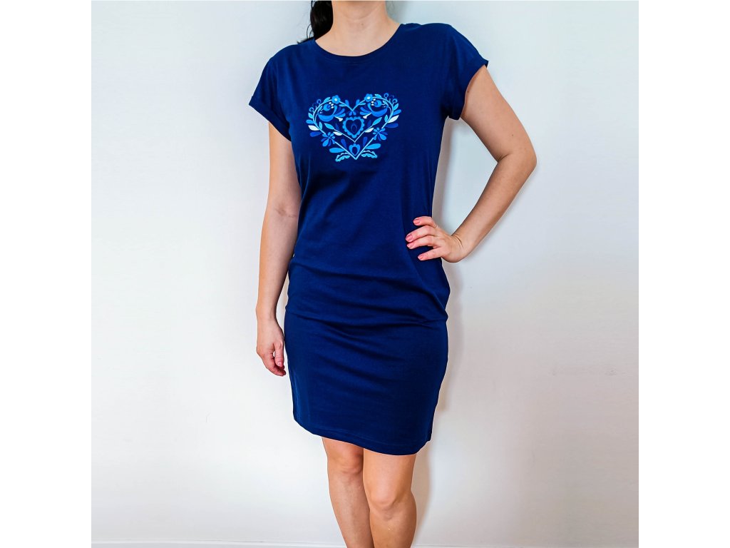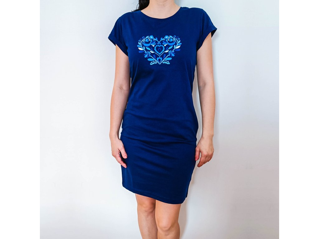 Elegantné dámske šaty s voľným, ľahko tvarovaným strihom doplnené o precíznu výšivku v tvare srdiečka v modrých odtieňoch. Dĺžka šiat je nad kolená.