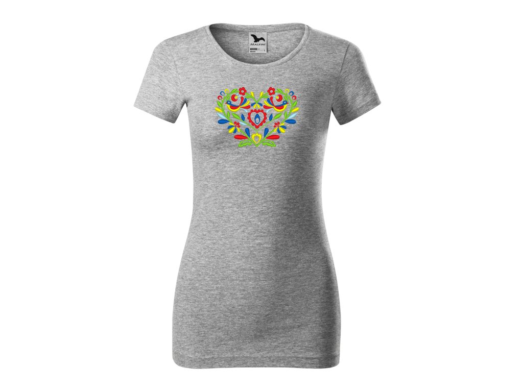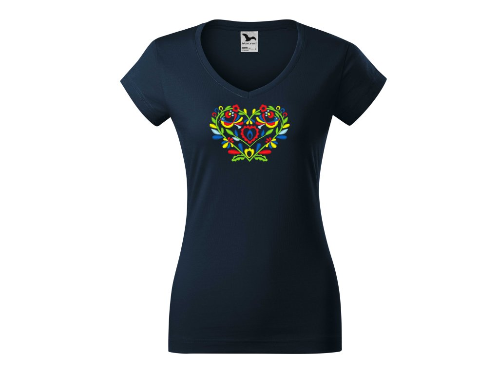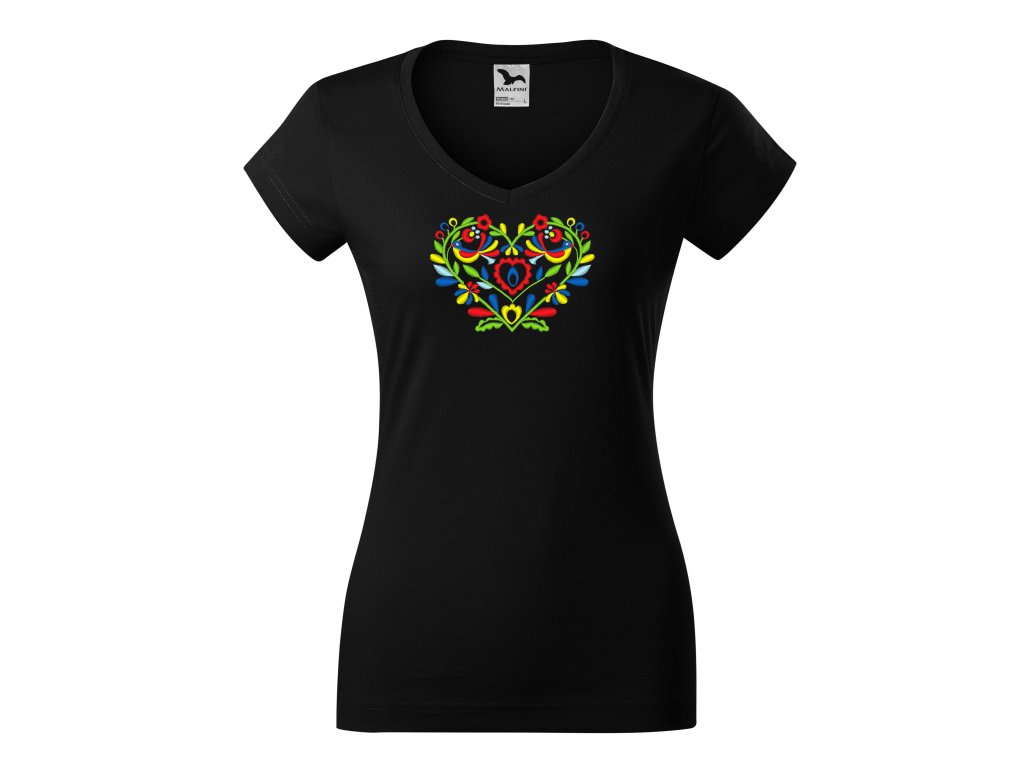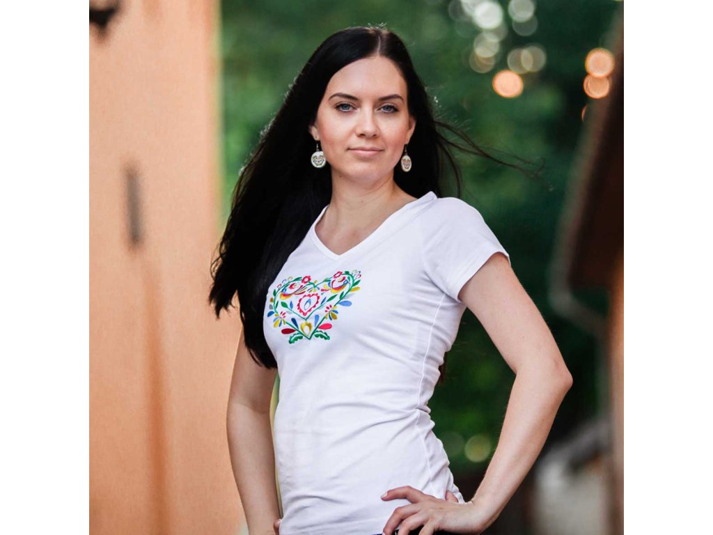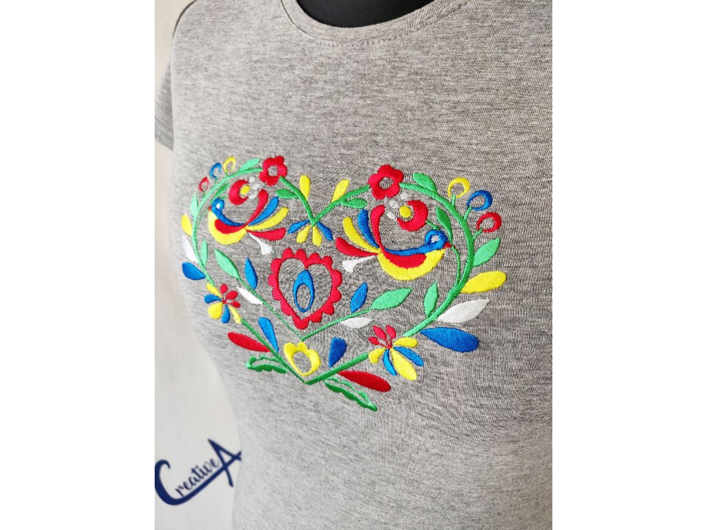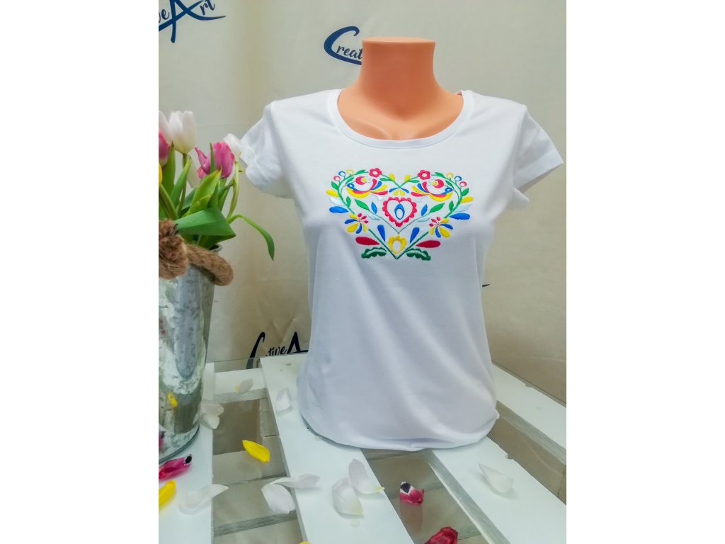 Dámske tričko s vyšívaným motívom inšpirovaným slovenským folklórom s možnosťou doplniť vlastný nápis v strede srdiečka ZADARMO