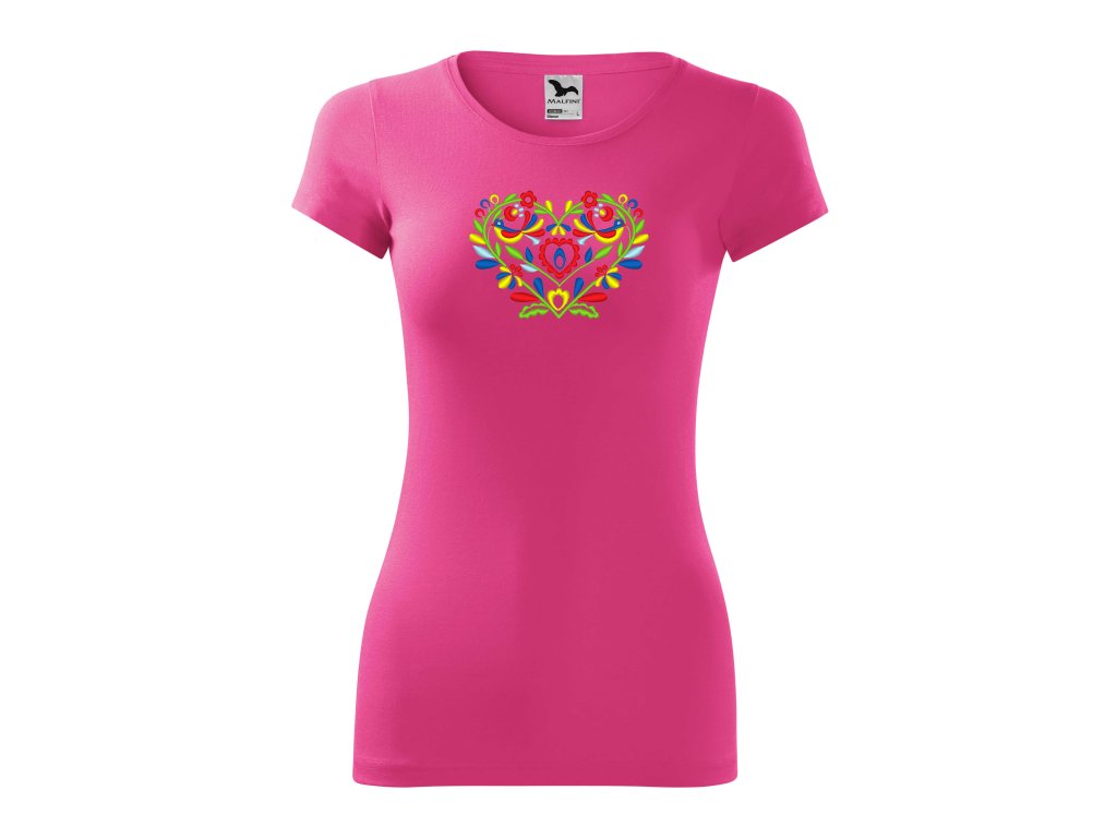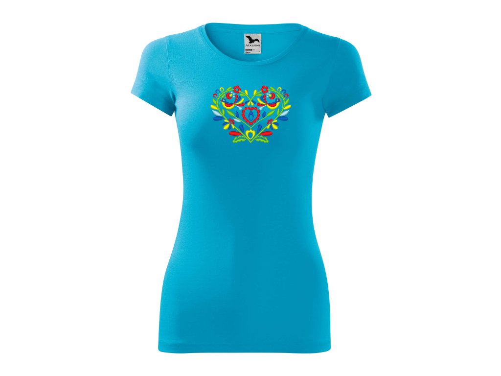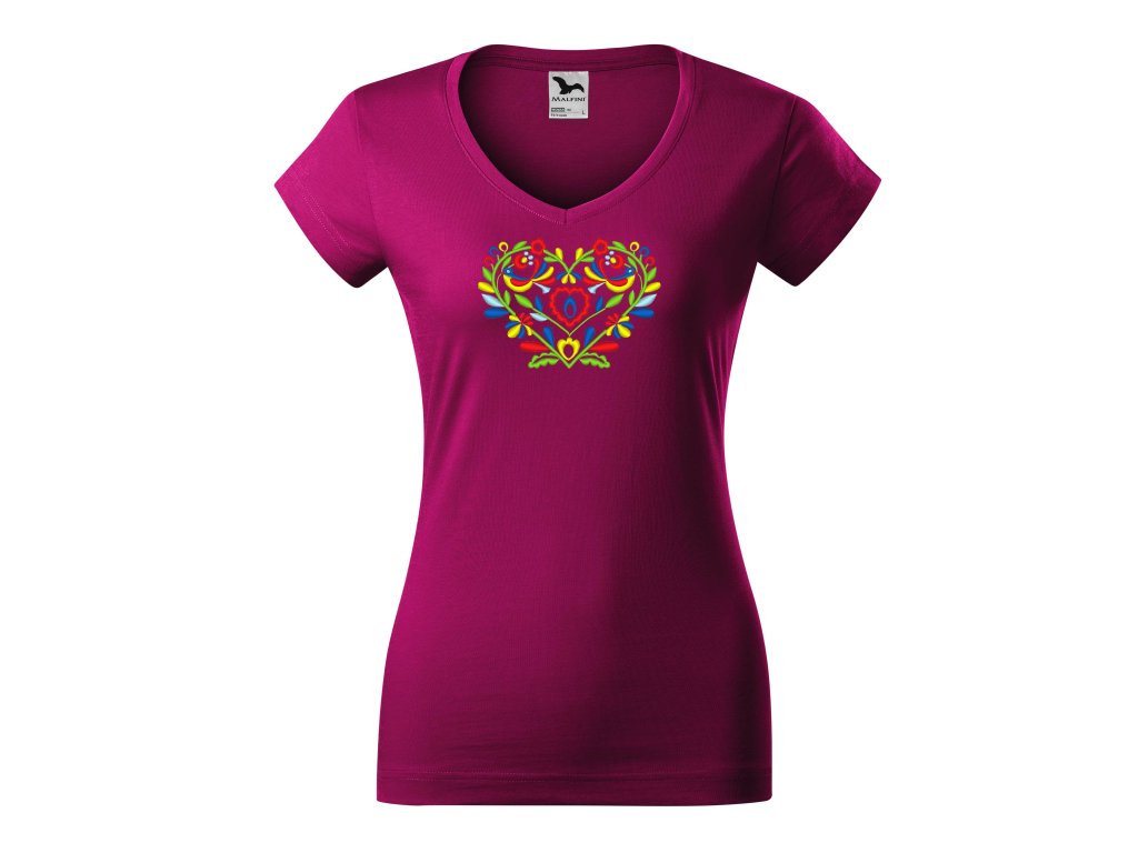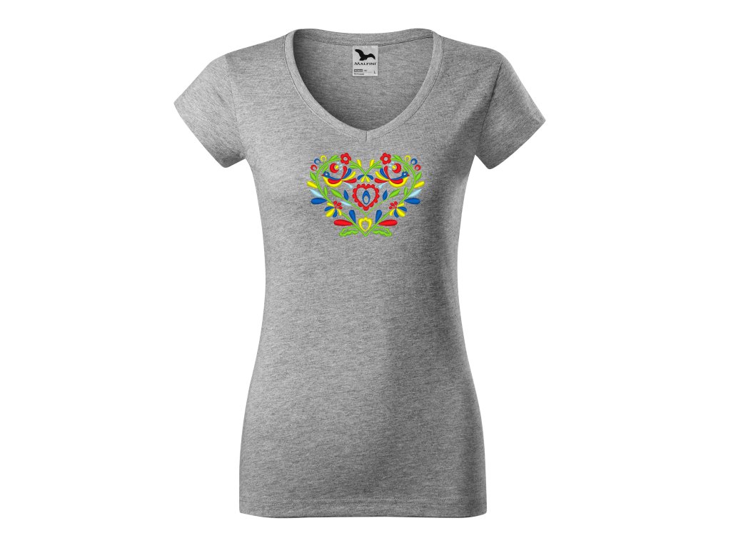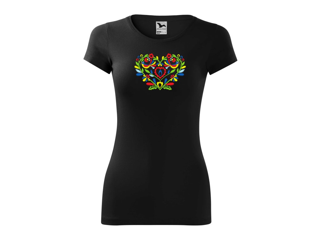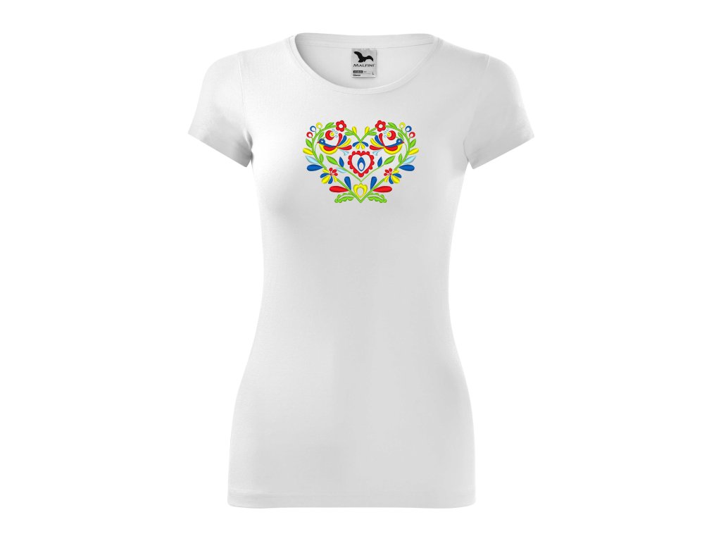Dámske tričko s vyšívaným motívom inšpirovaným slovenským folklórom s možnosťou doplniť vlastný nápis v strede srdiečka ZADARMO