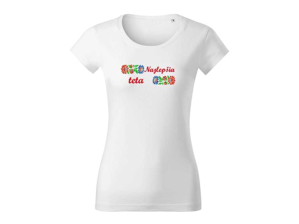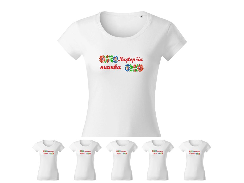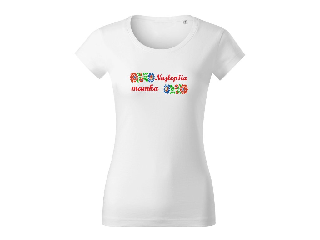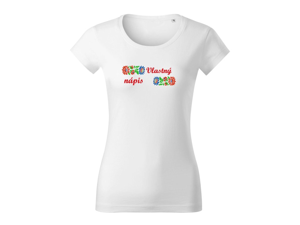 Trendové dámske tričko s originálnou výšivkou inšpirovanou slovenským folklórom a ornamentmi doplnenou o originálny nápis z našej ponuky alebo vlastný nápis v cene trička