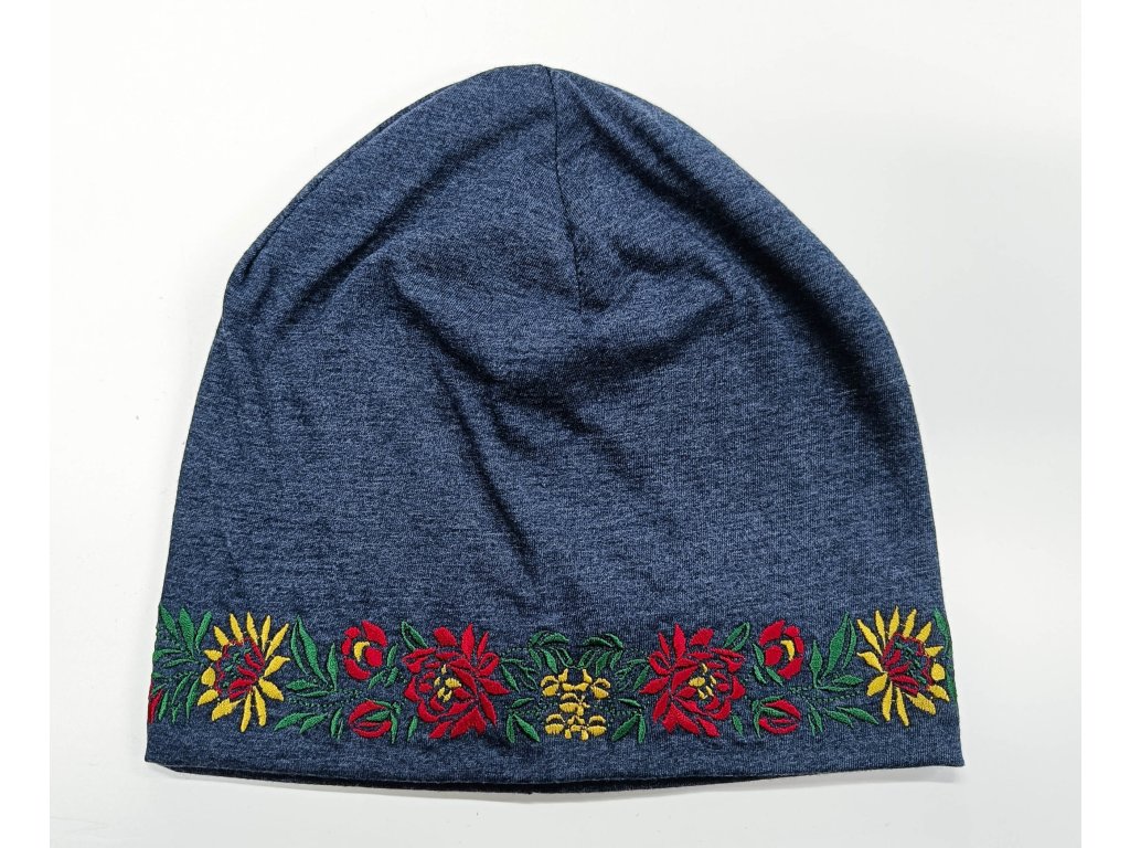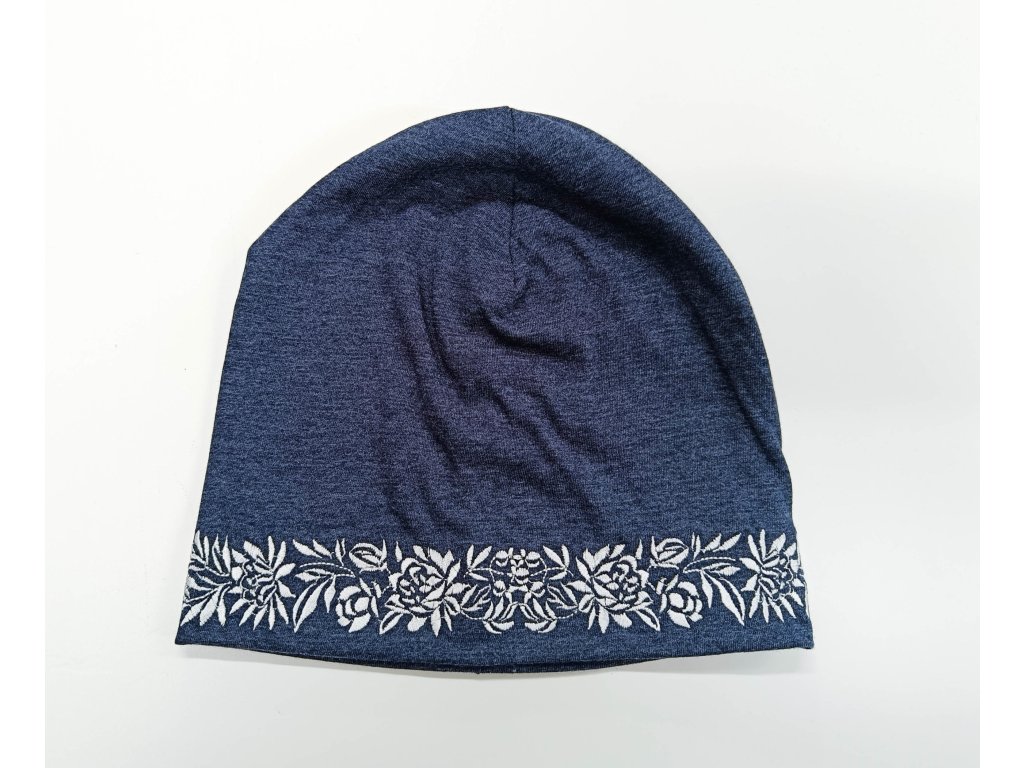 Unisex čiapka v denim modrom melíre s vyšívaným motívom vzoru Kristián výber farby výšivky, tenšie dvojvrstvové bavlnené, možnosť zvoliť si multifunkčnú šatku k čiapke za zvýhodnenú cenu!