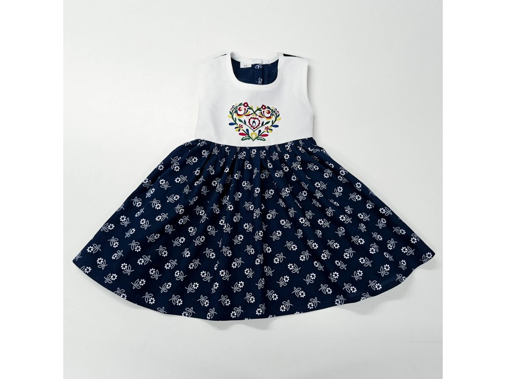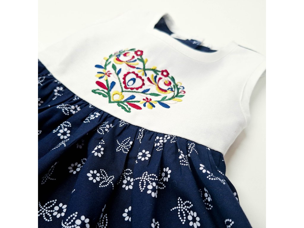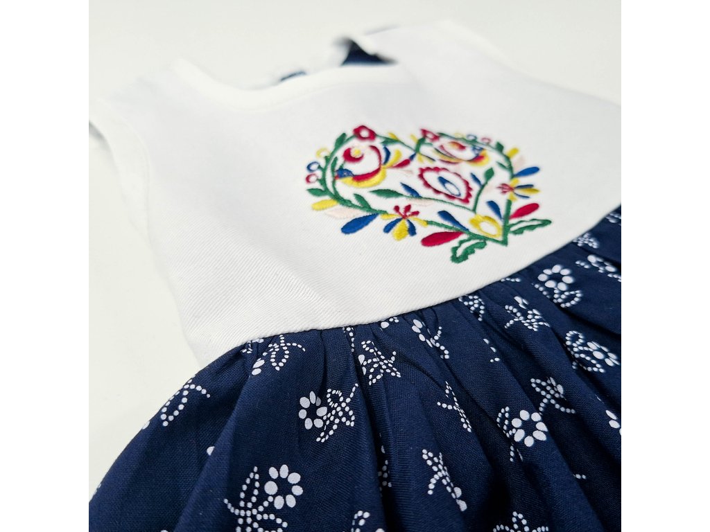 Detské šaty s folklórnou výšivkou IKA a kruhovou tmavomodrou folklórnou sukničkou
