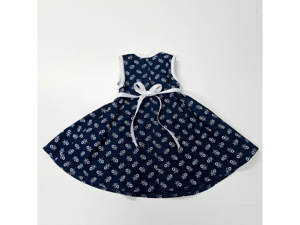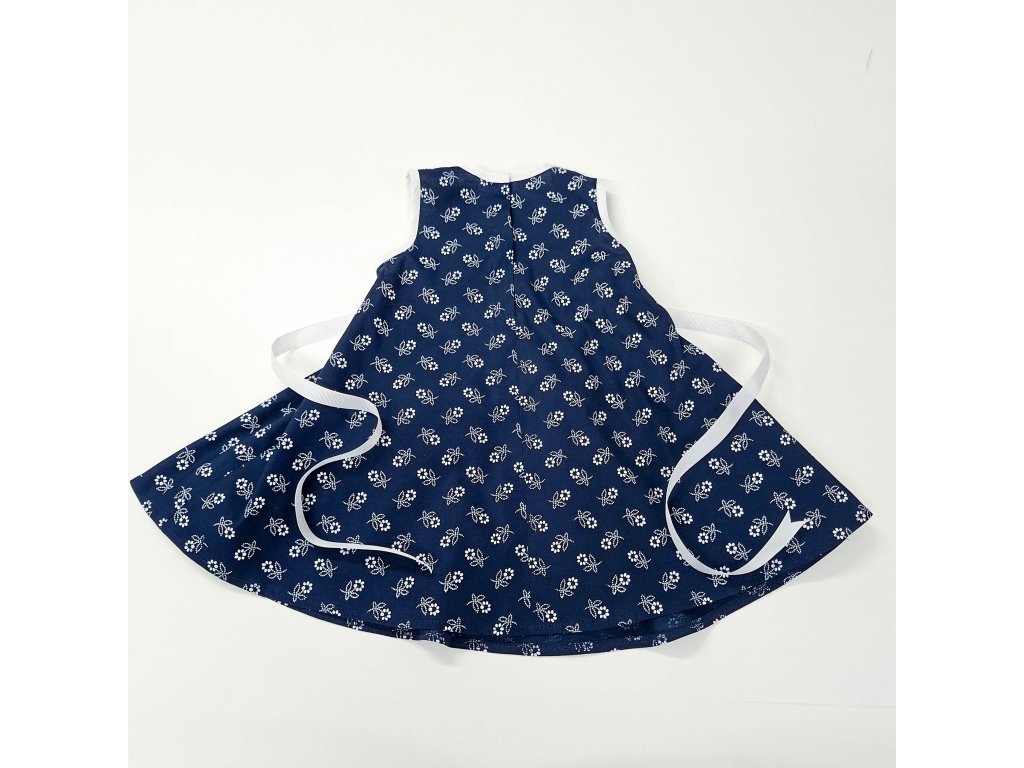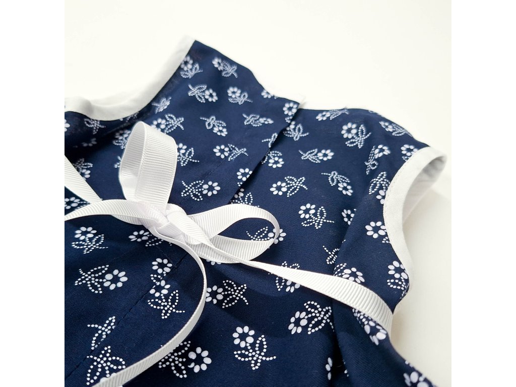 Šaty sú viazané stuhou vzadu, čím si upravíte potrebnú veľkosť a majú tmavomodrú kruhovú sukničku , vrchná časť na zapínanie patentkou.
