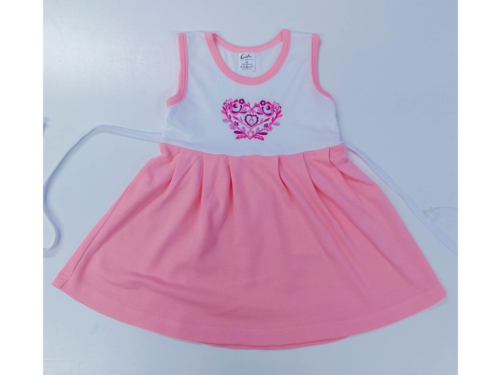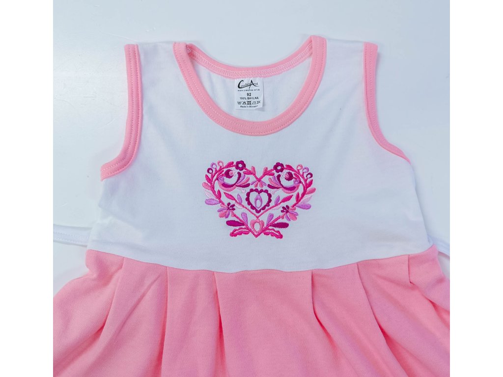 Detské bavlnené šaty ružové s folklórnou výšivkou na sedielku inšpirovanou slovenským folklórom.