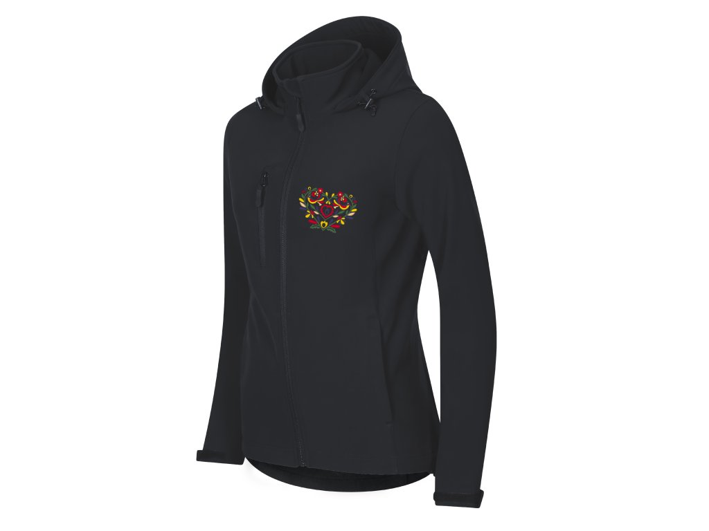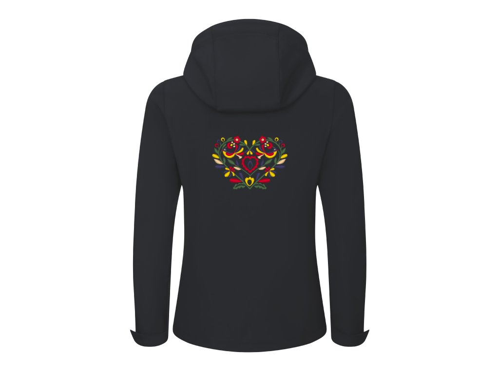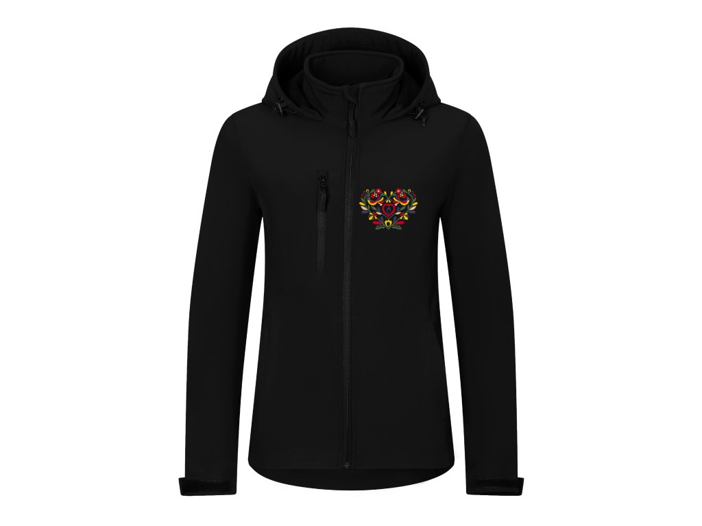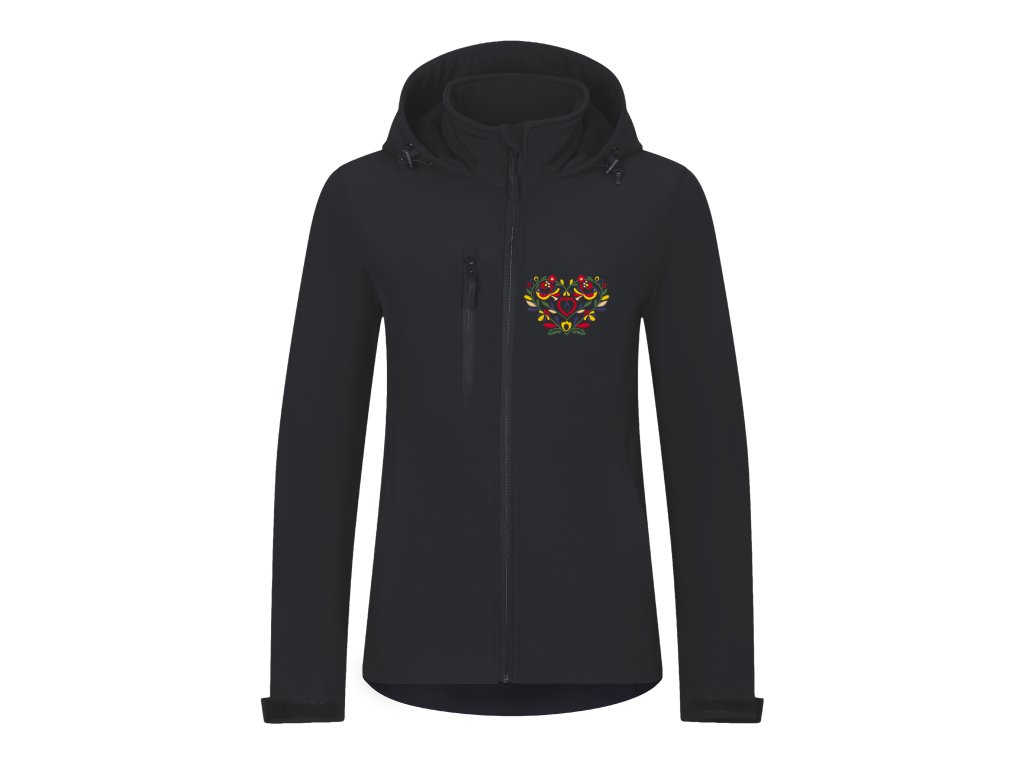 Praktická a pohodlná softshellová dámska bunda s precíznou výšivkou vzoru srdiečka inšpirovanou slovenským folklórom a ornamentmi vo farebnom prevedení. Vzor je vyšívaný na prednom a zadnom diele bundy. Vpredu je výšivka na úrovni náprsného vrecka, vzadu na úrovni lopatiek pod kapucňou.
