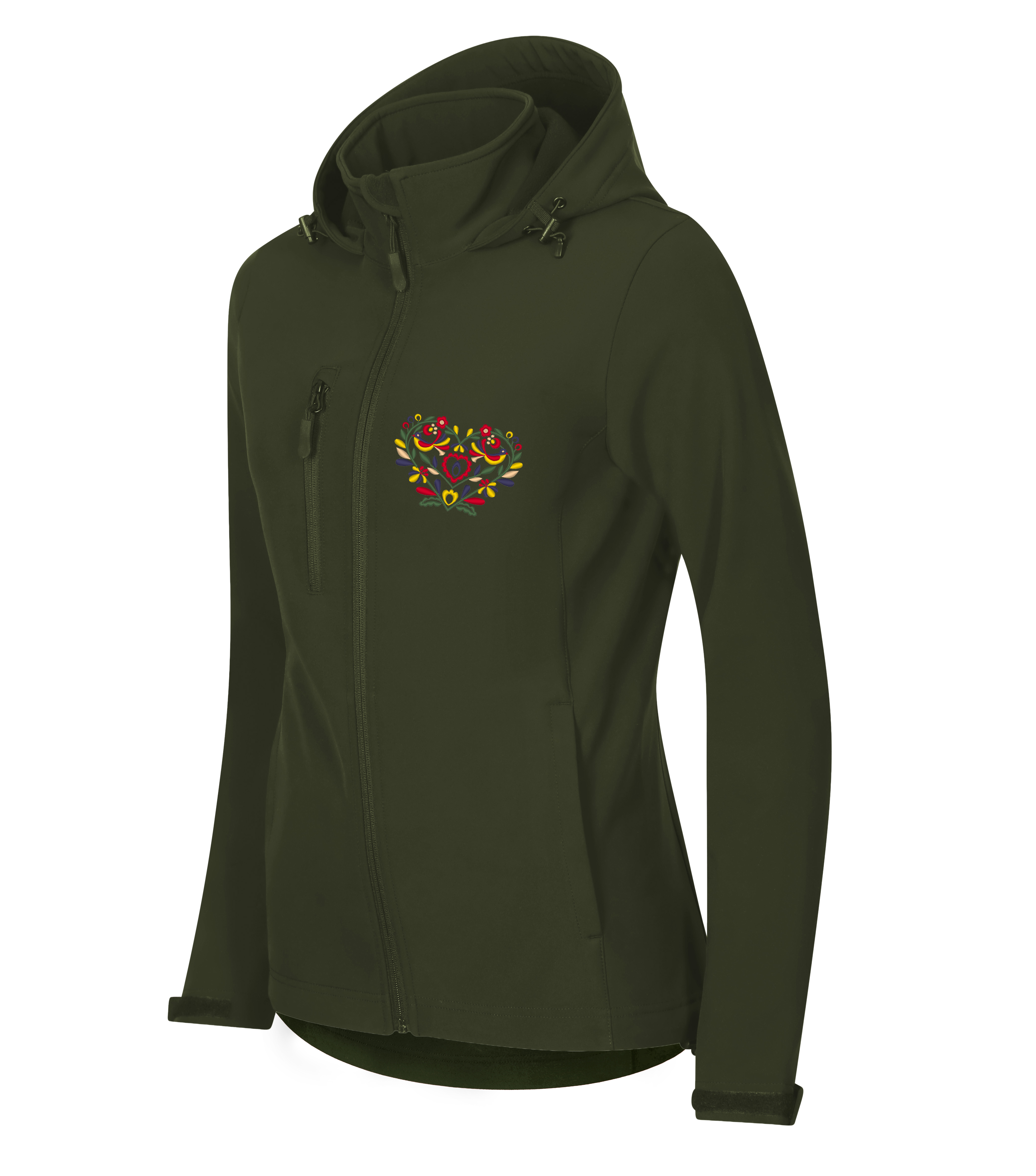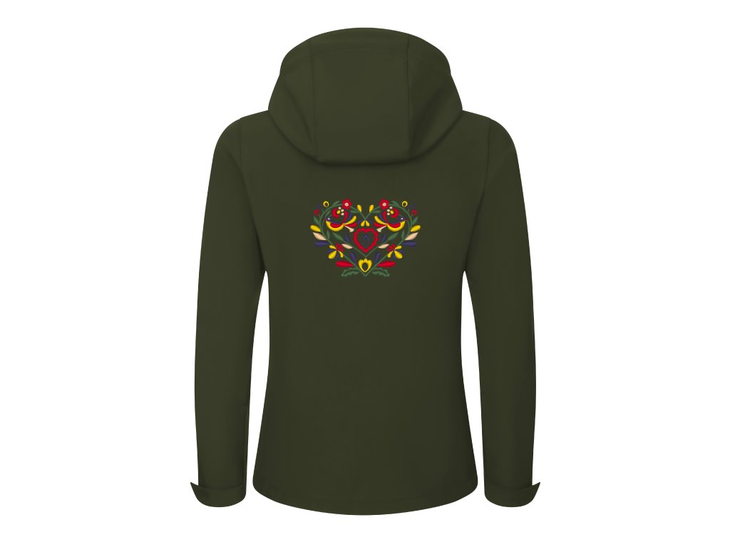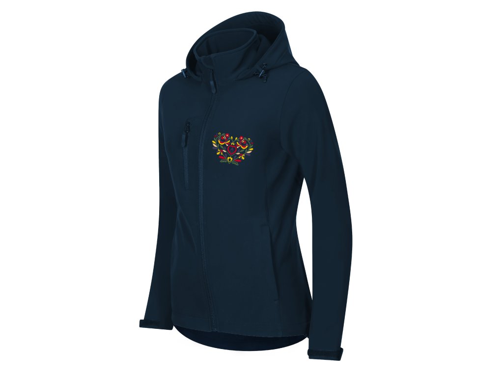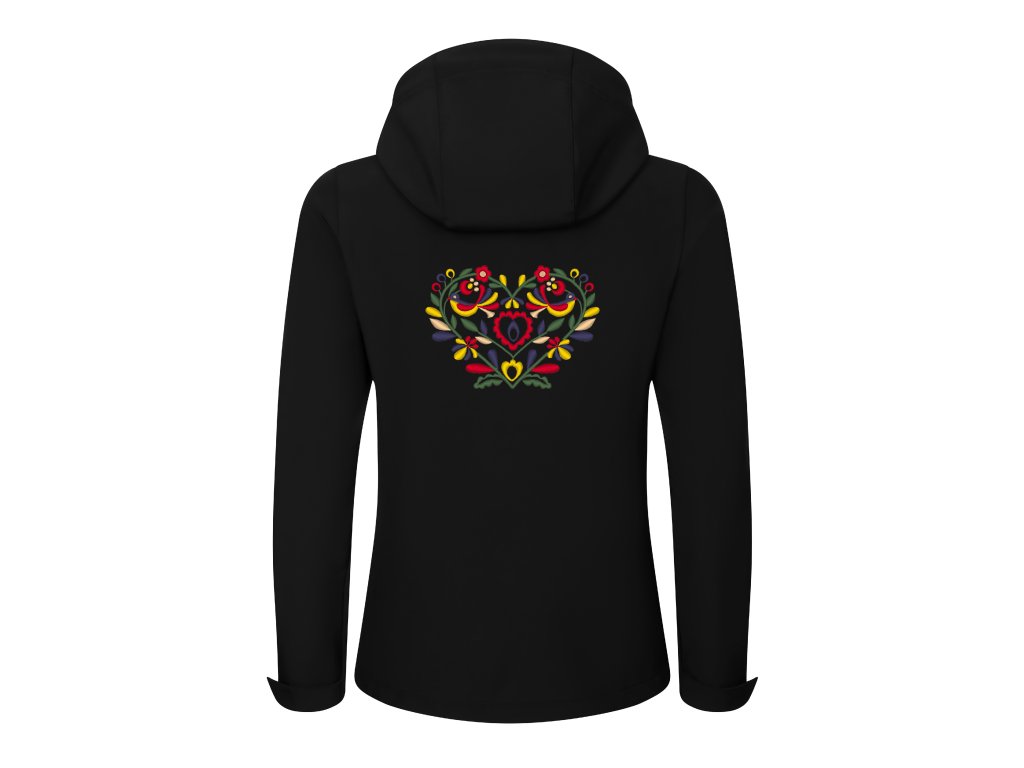 Praktická a pohodlná softshellová dámska bunda s precíznou výšivkou vzoru srdiečka inšpirovanou slovenským folklórom a ornamentmi vo farebnom prevedení. Vzor je vyšívaný na prednom a zadnom diele bundy. Vpredu je výšivka na úrovni náprsného vrecka, vzadu na úrovni lopatiek pod kapucňou.
