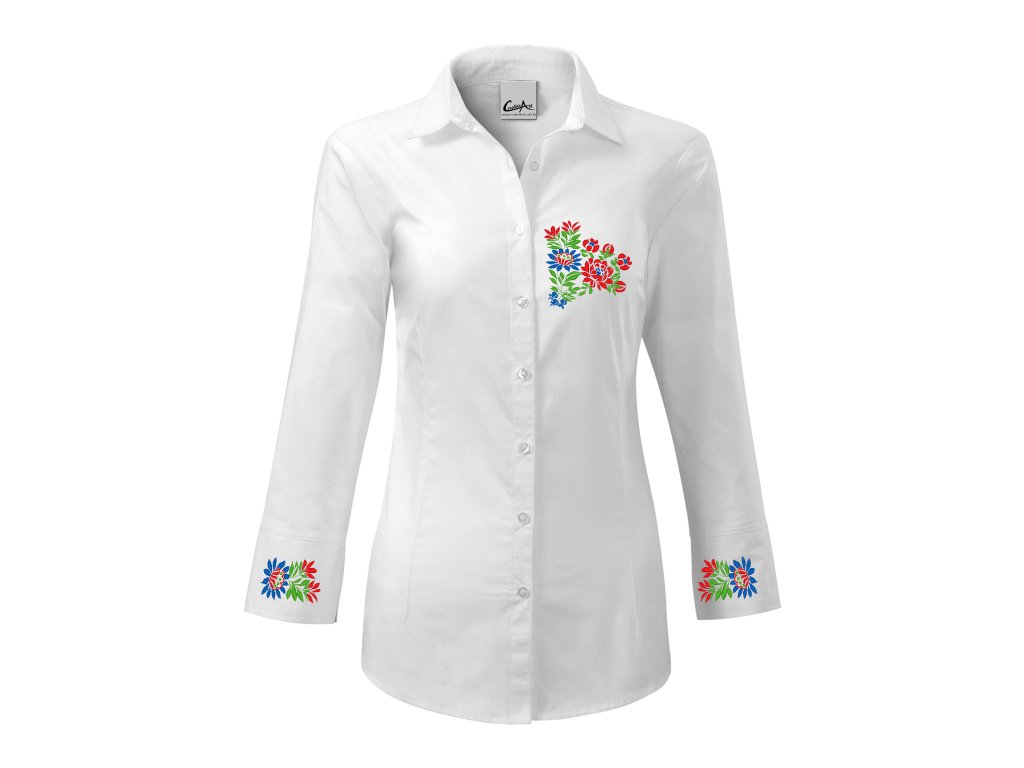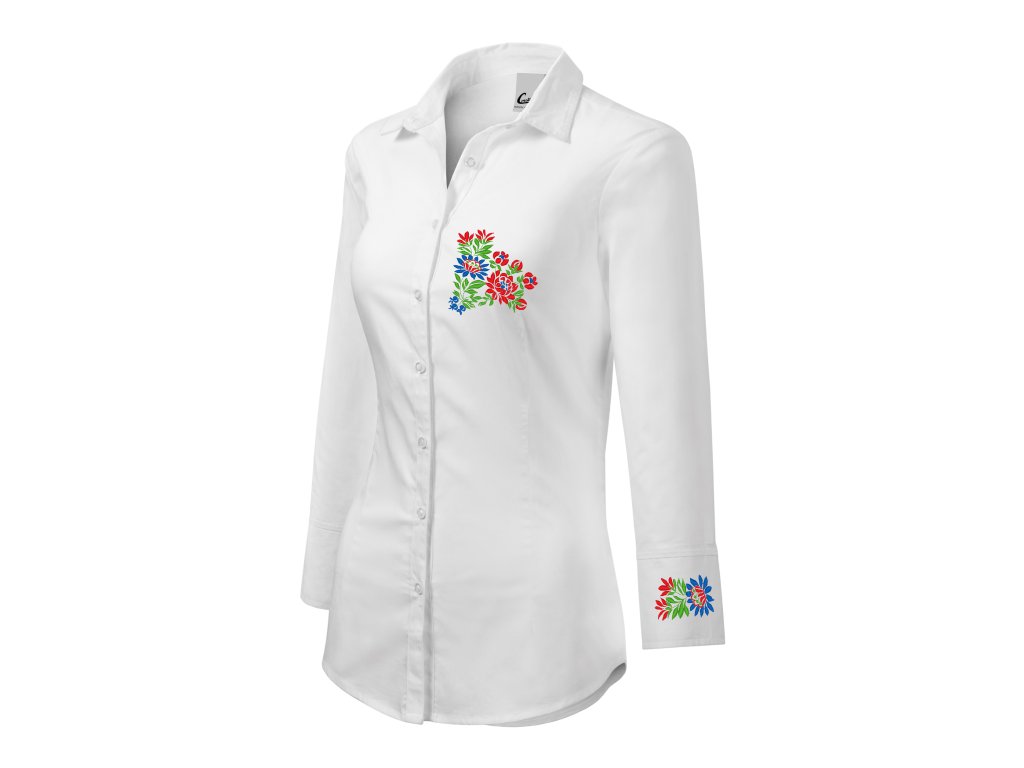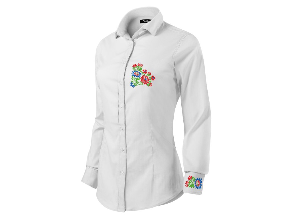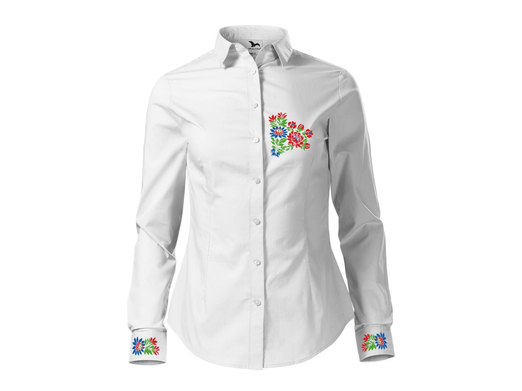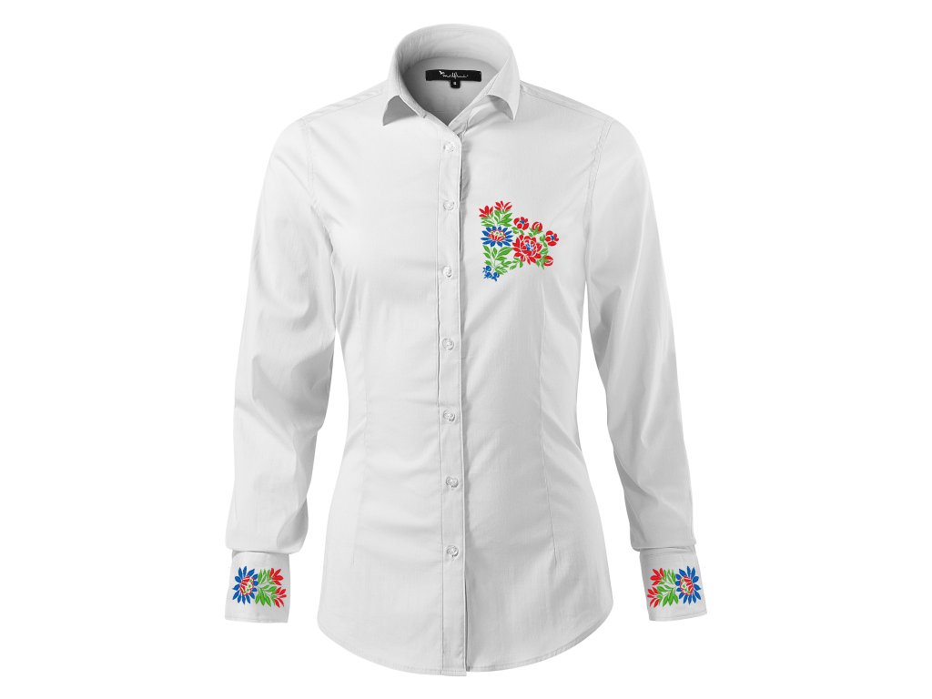 Dámska elegantná košeľa s jedinečným ľudovým motívom vyšívaným na manžetách a na hrudi vo farebnom prevedení.