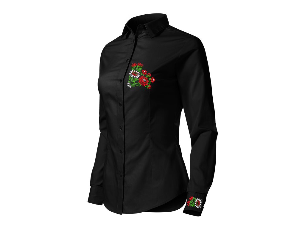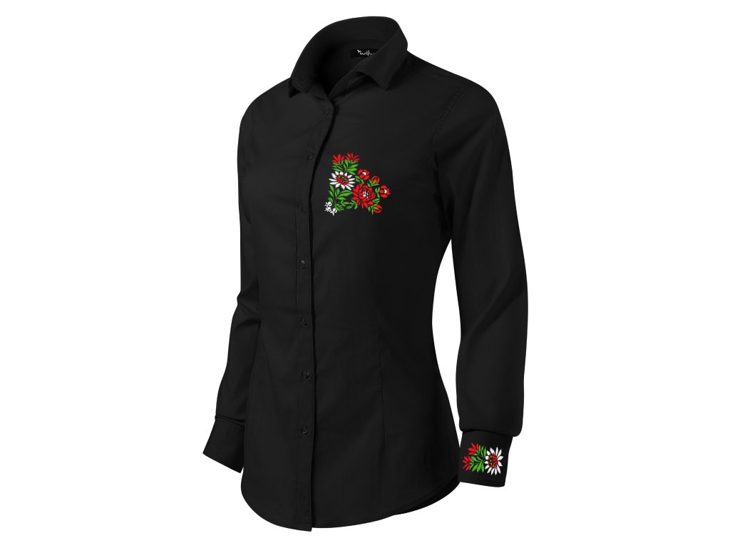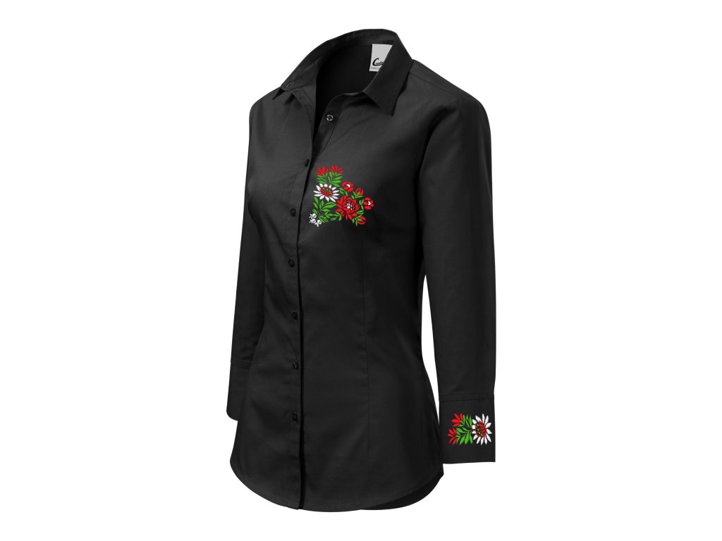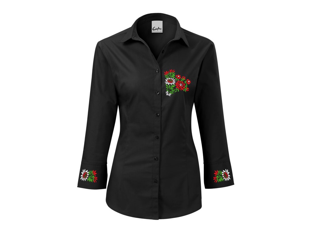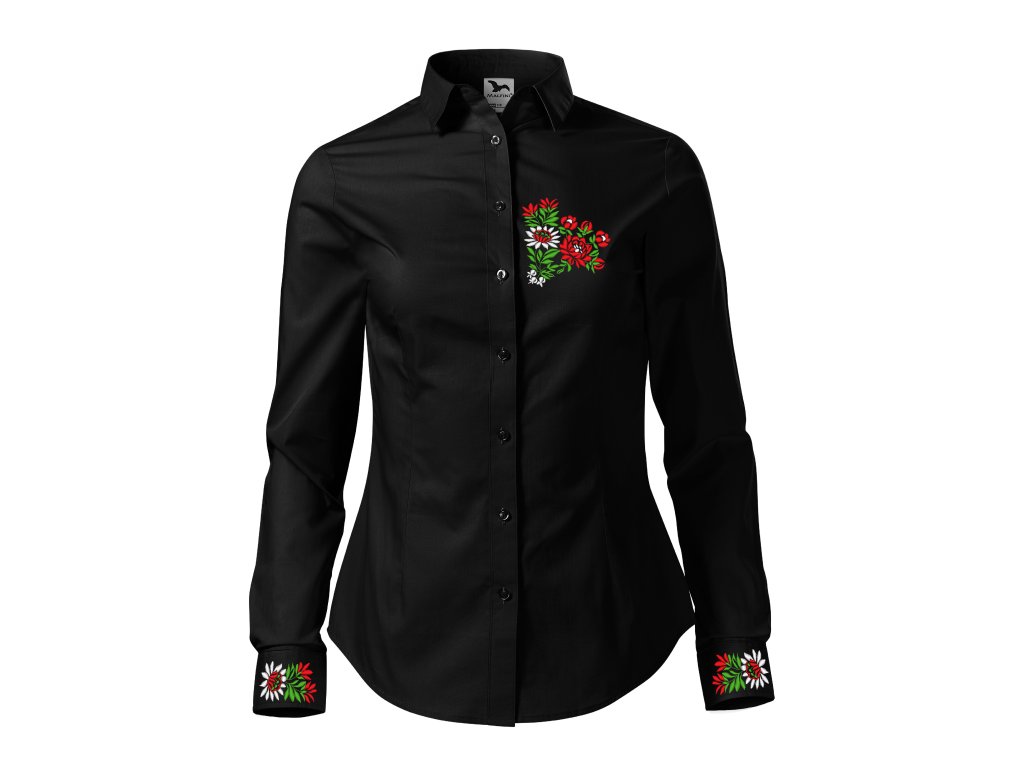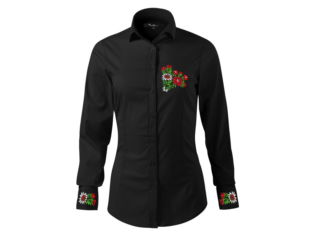 Dámska elegantná košeľa s jedinečným ľudovým motívom vyšívaným na manžetách a na hrudi vo farebnom prevedení.