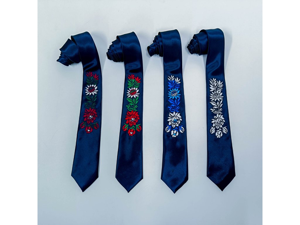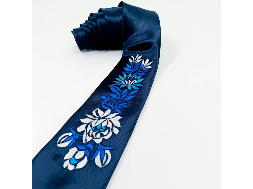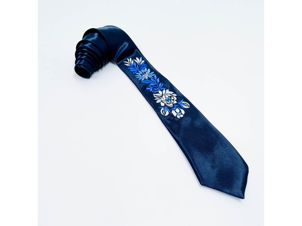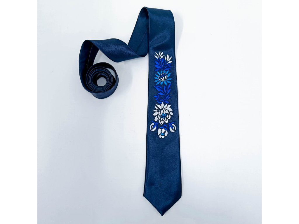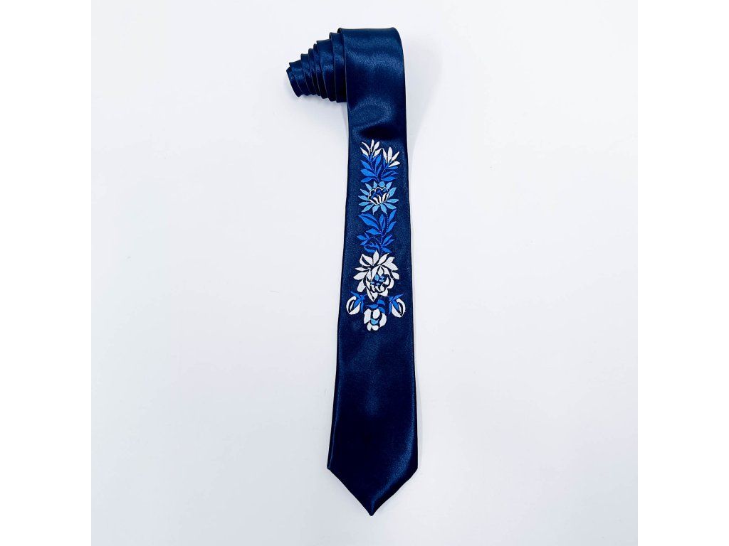 Pánska elegantná saténová kravata v tmavomodrej farbe s vyšívaným ľudovým motívom inšpirovaným slovenským folklórom vyrábaná v limitovanej edícii niekoľkých kusov z každého vzoru a farby