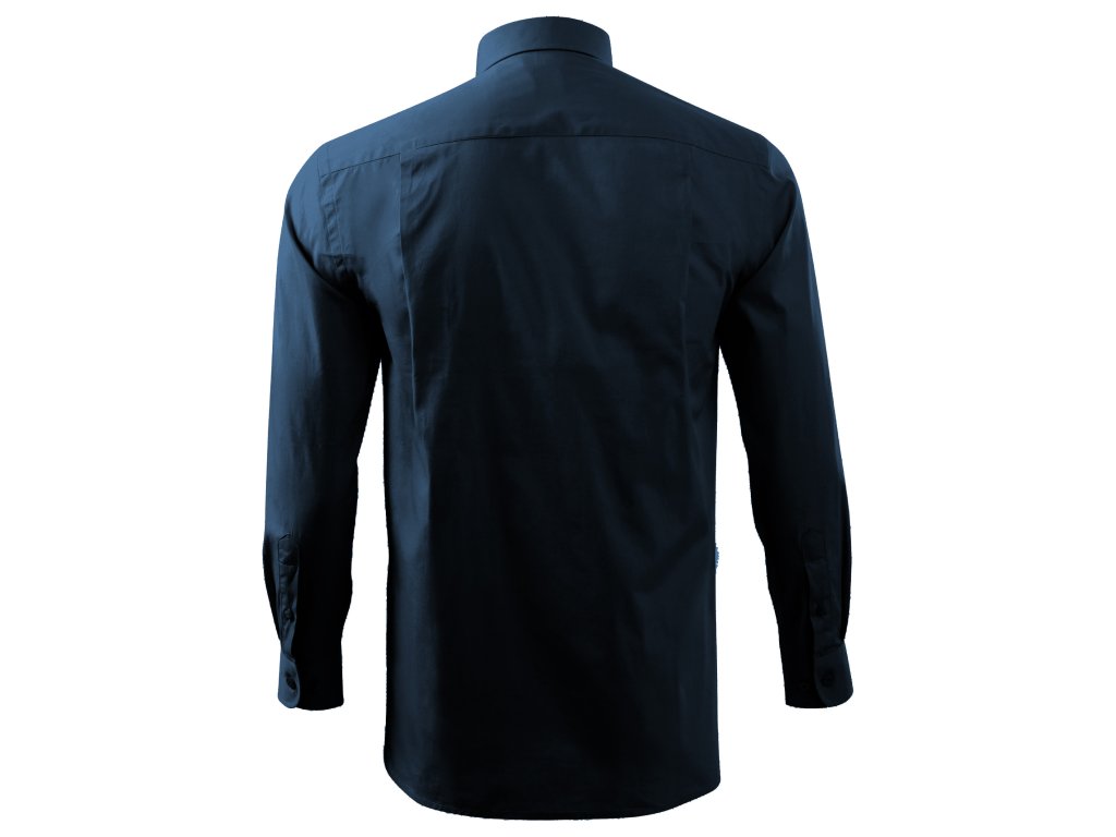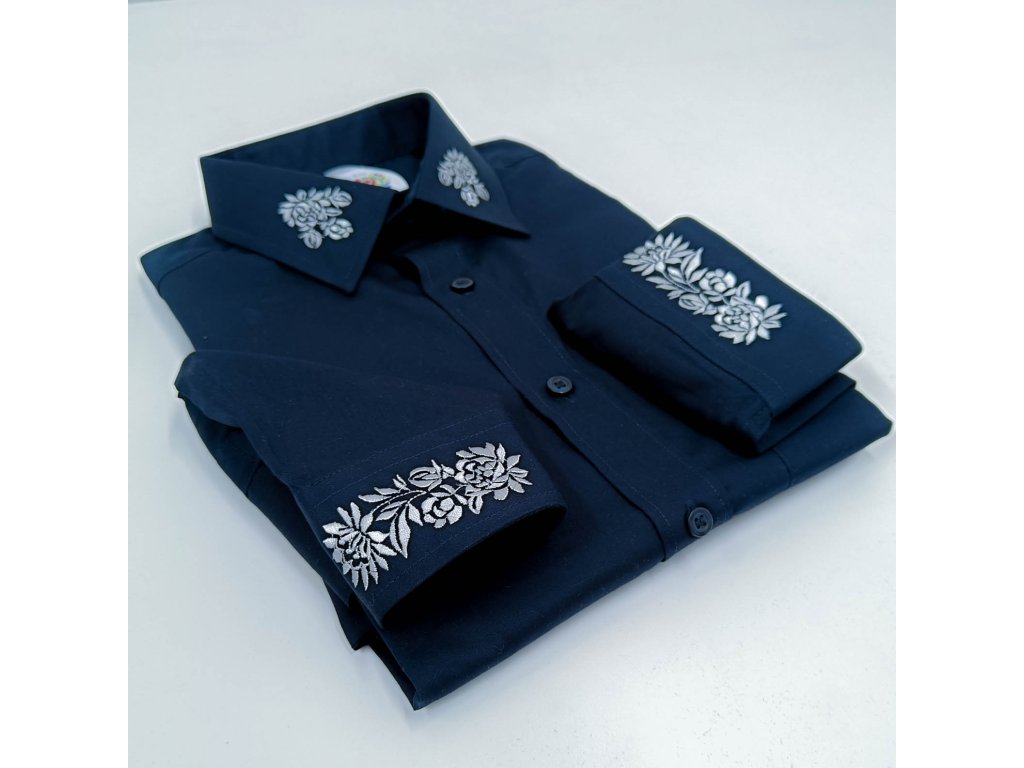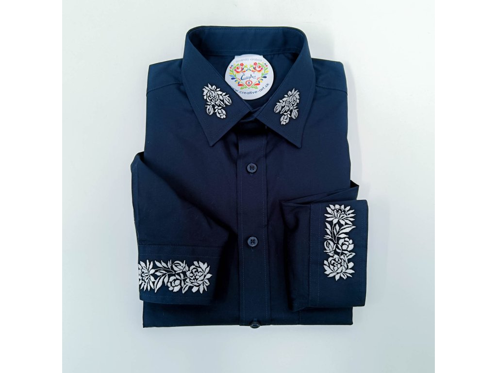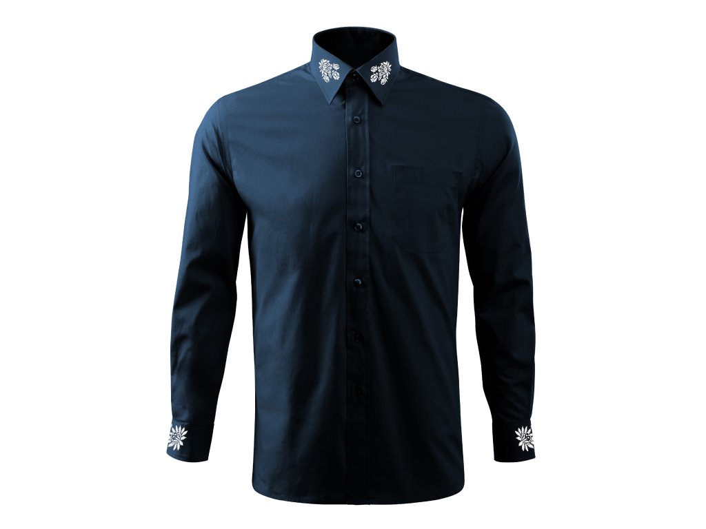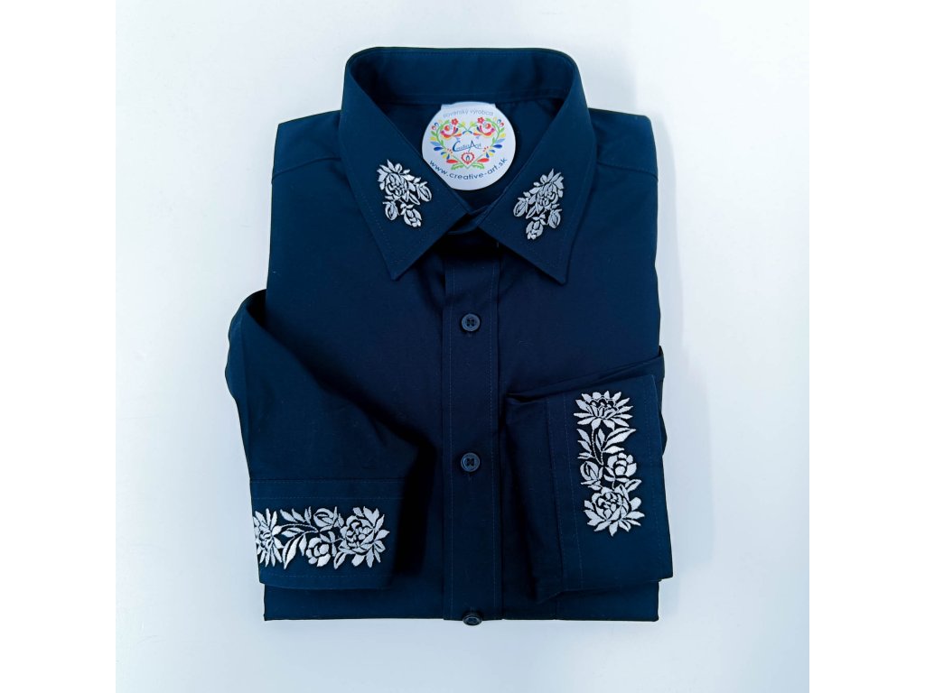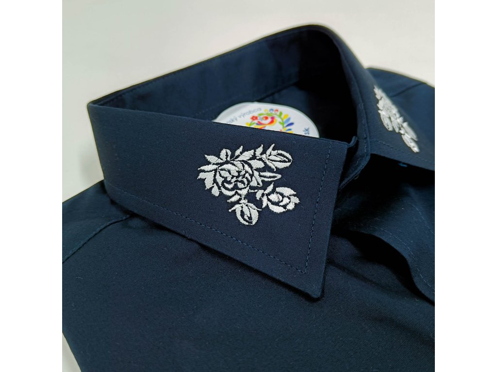 Pánska elegantná košeľa v tmavomodrej farbe s jedinečným ľudovým motívom vyšívaným na golieri a manžetách v bielej farbe