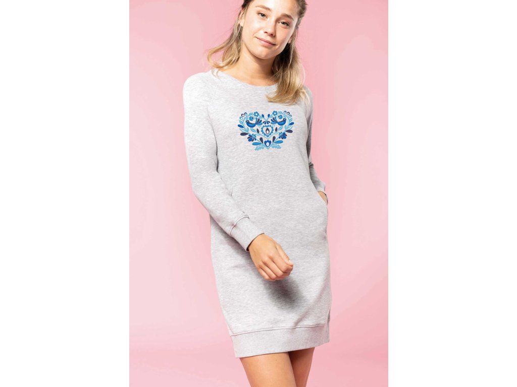 Dámske vyšívané šaty bez kapucne vo farbe sivý melír na štýl predĺženej mikiny s výšivkou vzor IKA v rôznych farebných prevedeniach výšivky.