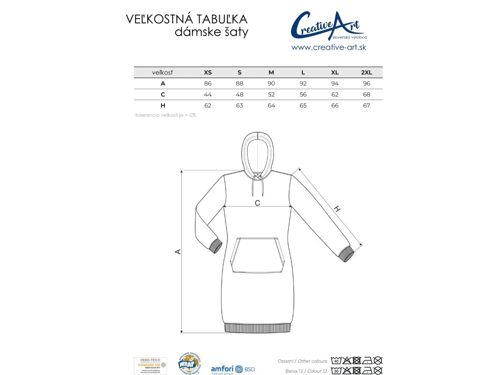 Šaty majú zľahka vypasovaný strih s bočnými švami, dĺžka šiat je nad kolená (viď veľkostná tabuľka), doplnené kapucňou na stiahnutie so šnúrkami, klokaním vreckom, vnútorná strana je nepočesaná (nežmolkuje sa). Dolný lem a manžety sú z rebrového úpletu.