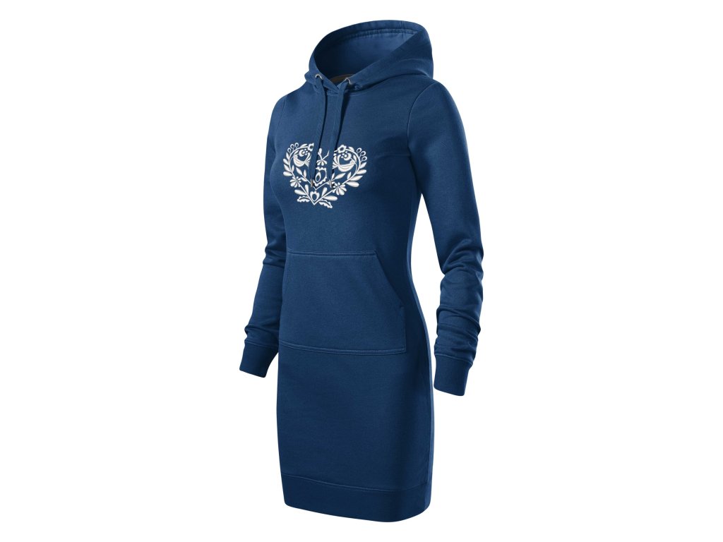 Dámske vyšívané šaty s kapucňou polnočná modrá na štýl predĺženej mikiny s výšivkou vzor IKA v jednofarebnom bielom prevedení.