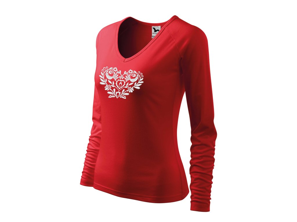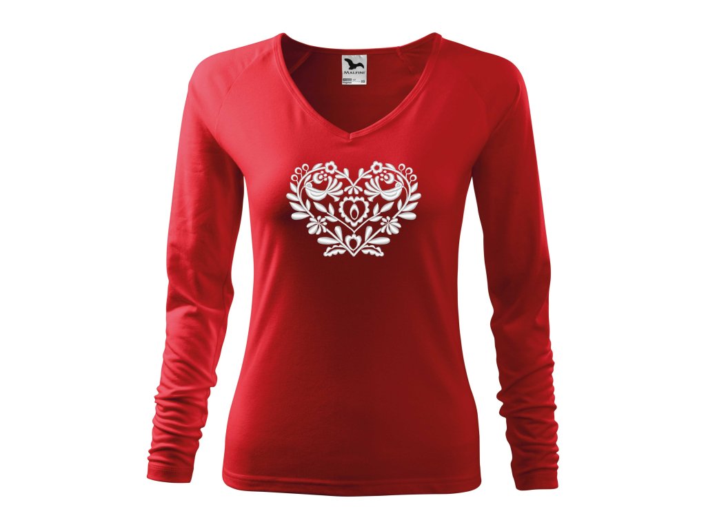 Elegantné dámske tričko s vkusne zladenou výšivkou v tvare srdiečka v bielom prevedení inšpirovanou slovenským folklórom