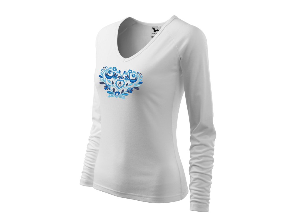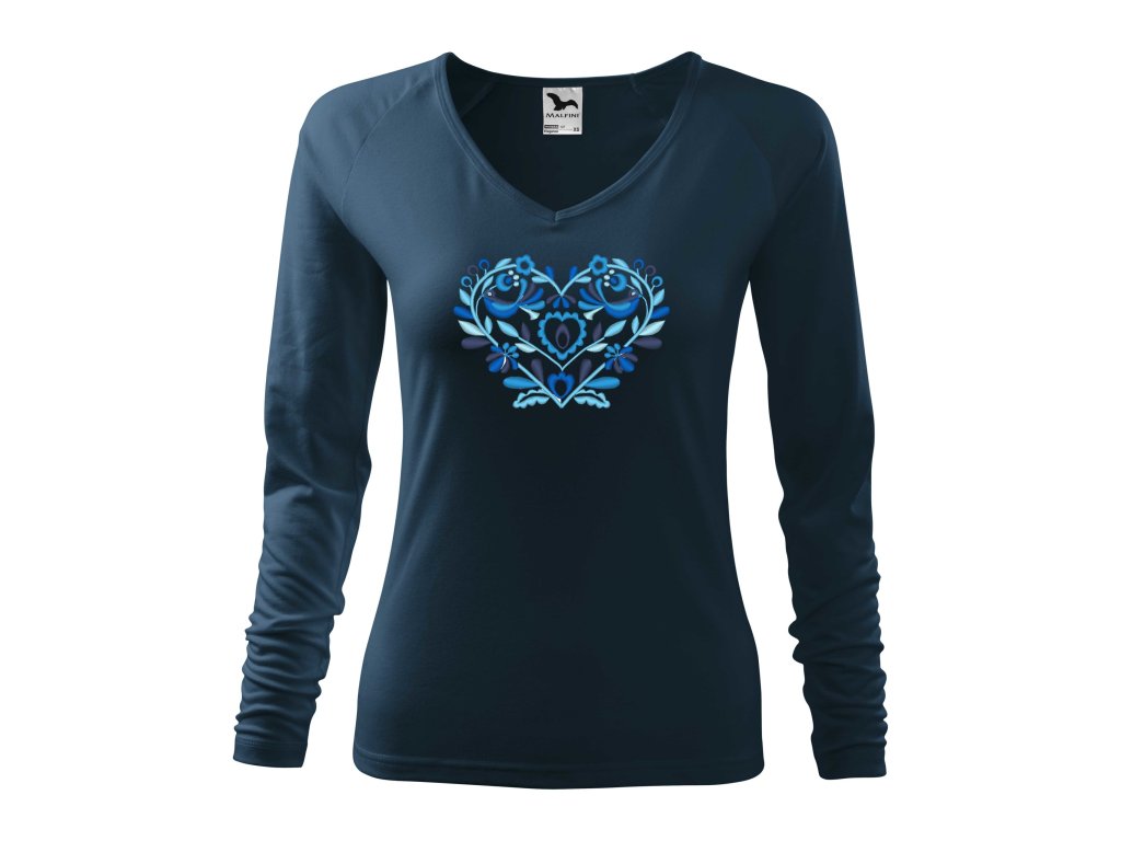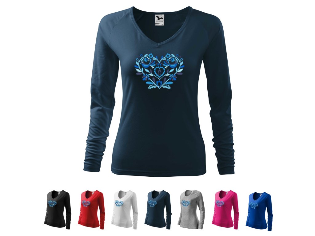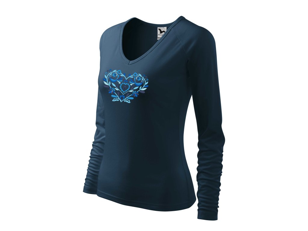 Elegantné dámske tričko s vkusne zladenou výšivkou v tvare srdiečka v modrých odtieňoch, inšpirovanou slovenským folklórom