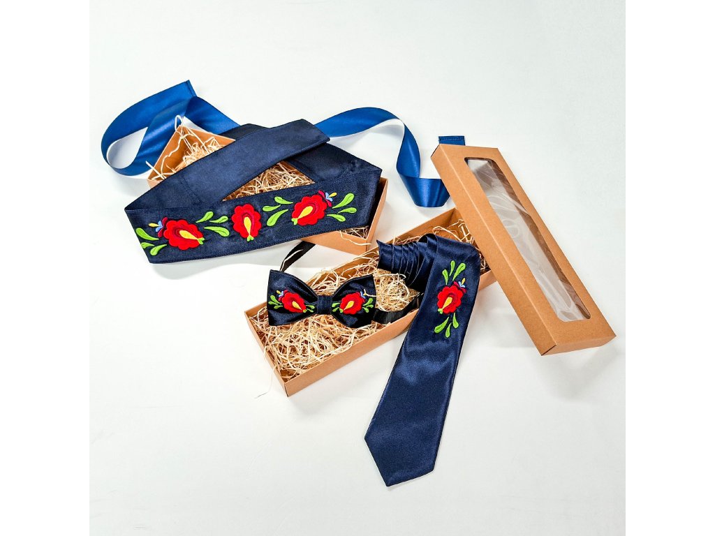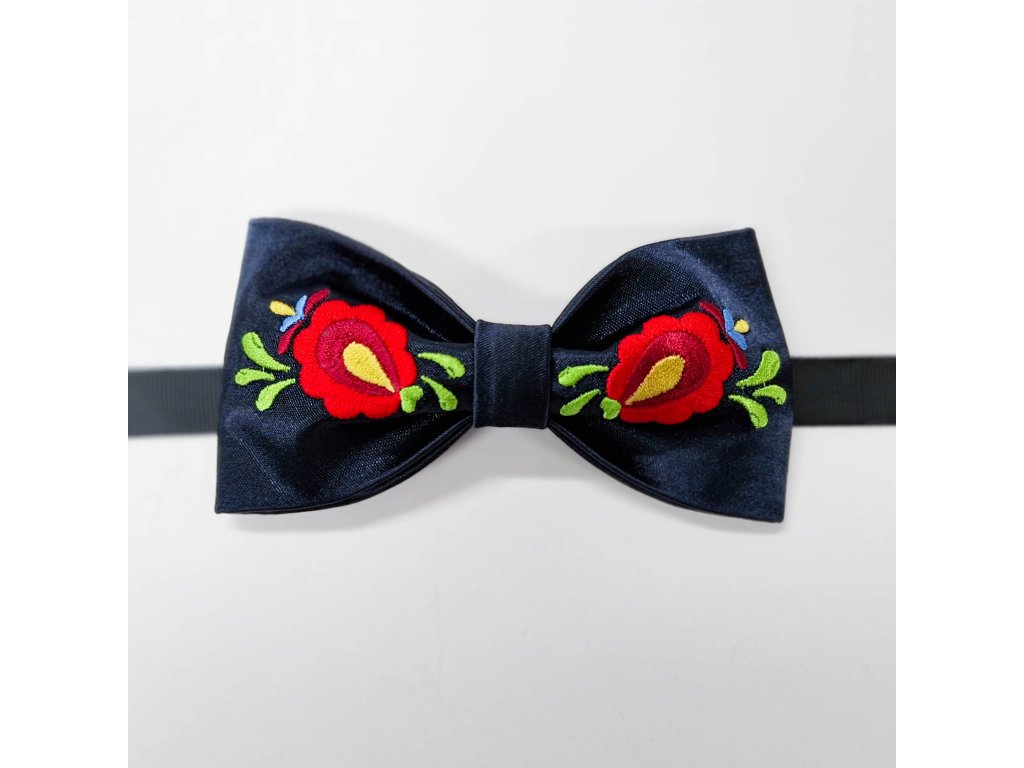 Elegantný pánsky tmavomodrý saténový motýlik s vyšívaným ľudovým motívom inšpirovaným slovenským folklórom vyrábaný v limitovanej edícii niekoľkých kusov.