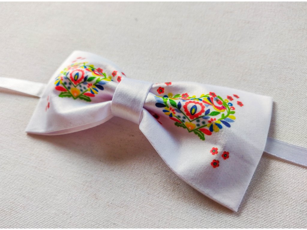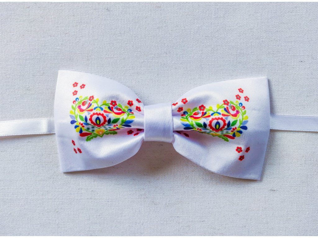 Elegantný motýlik v bielej farbe s potlačou folklórneho vzoru.