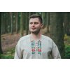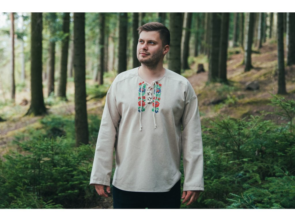 Pánska košeľa Kristián z režného plátna vo voľnom, pohodlnom štýle s viazaním na šnúrku, doplnená o folklórnu výšivku zo Slovenska.