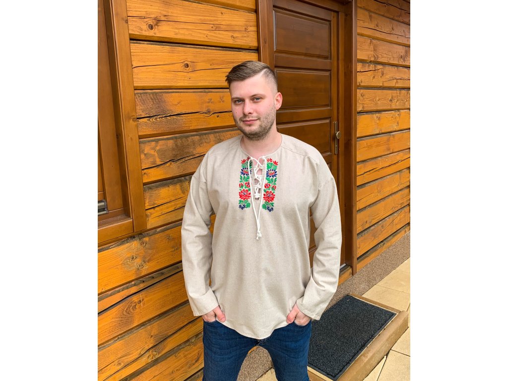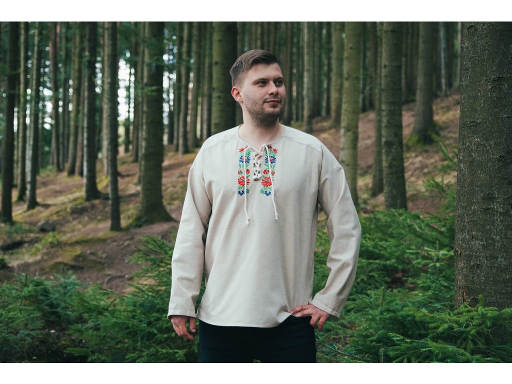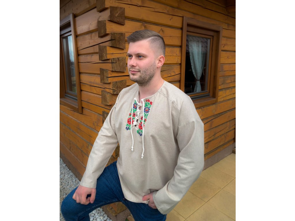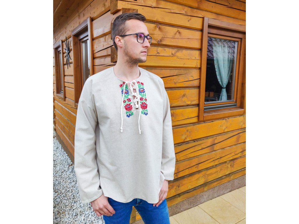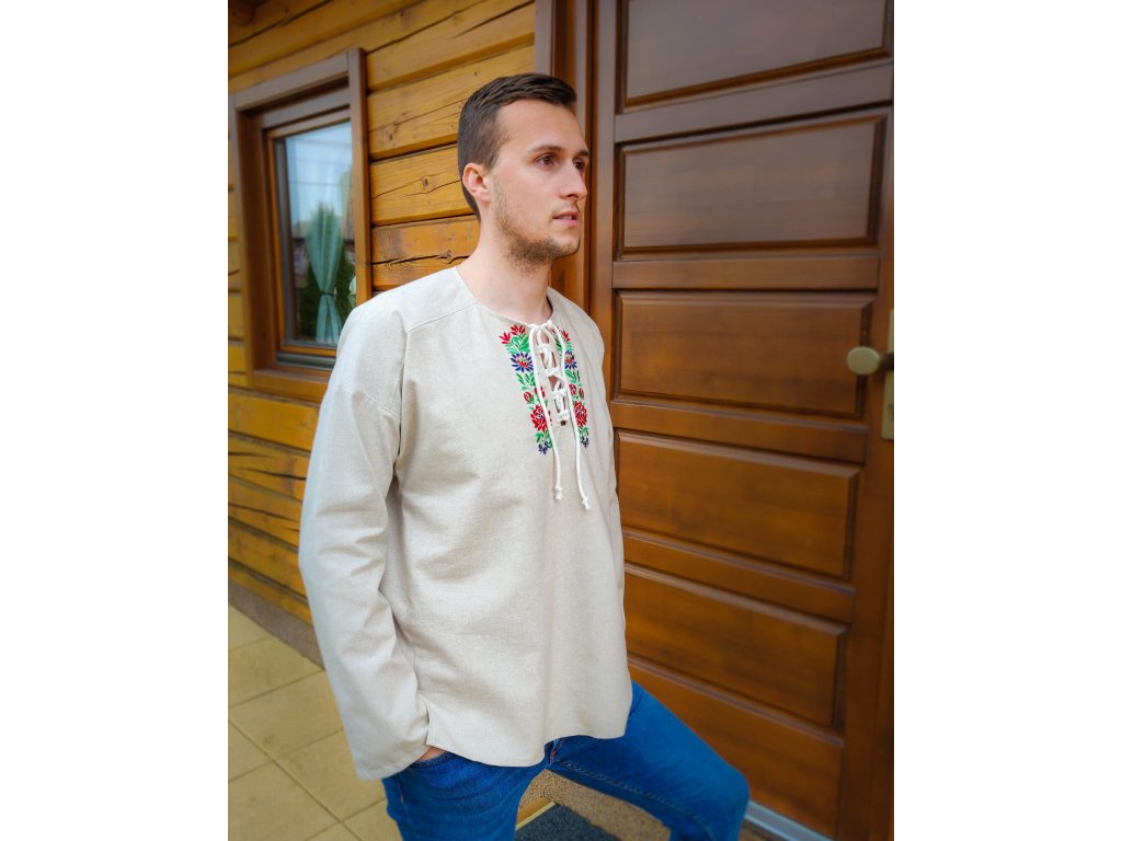 Pánska košeľa Kristián z režného plátna vo voľnom, pohodlnom štýle s viazaním na šnúrku, doplnená o folklórnu výšivku zo Slovenska.