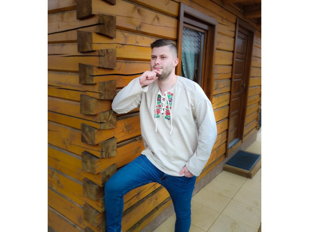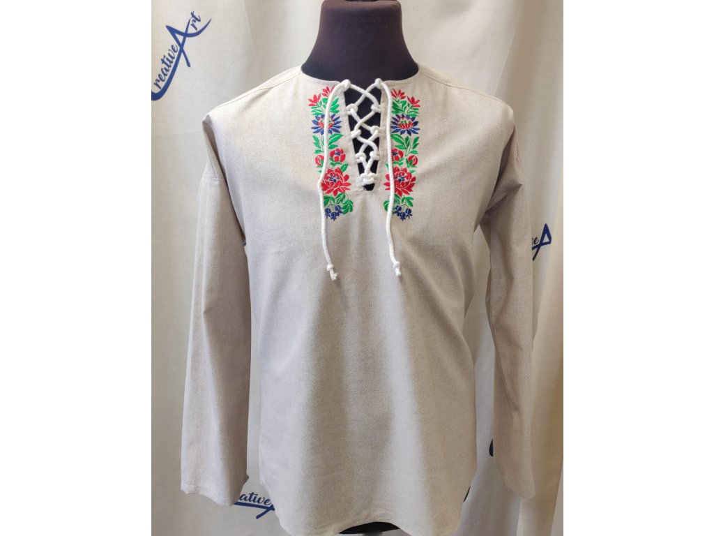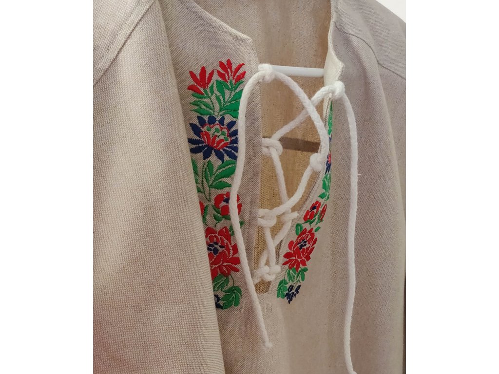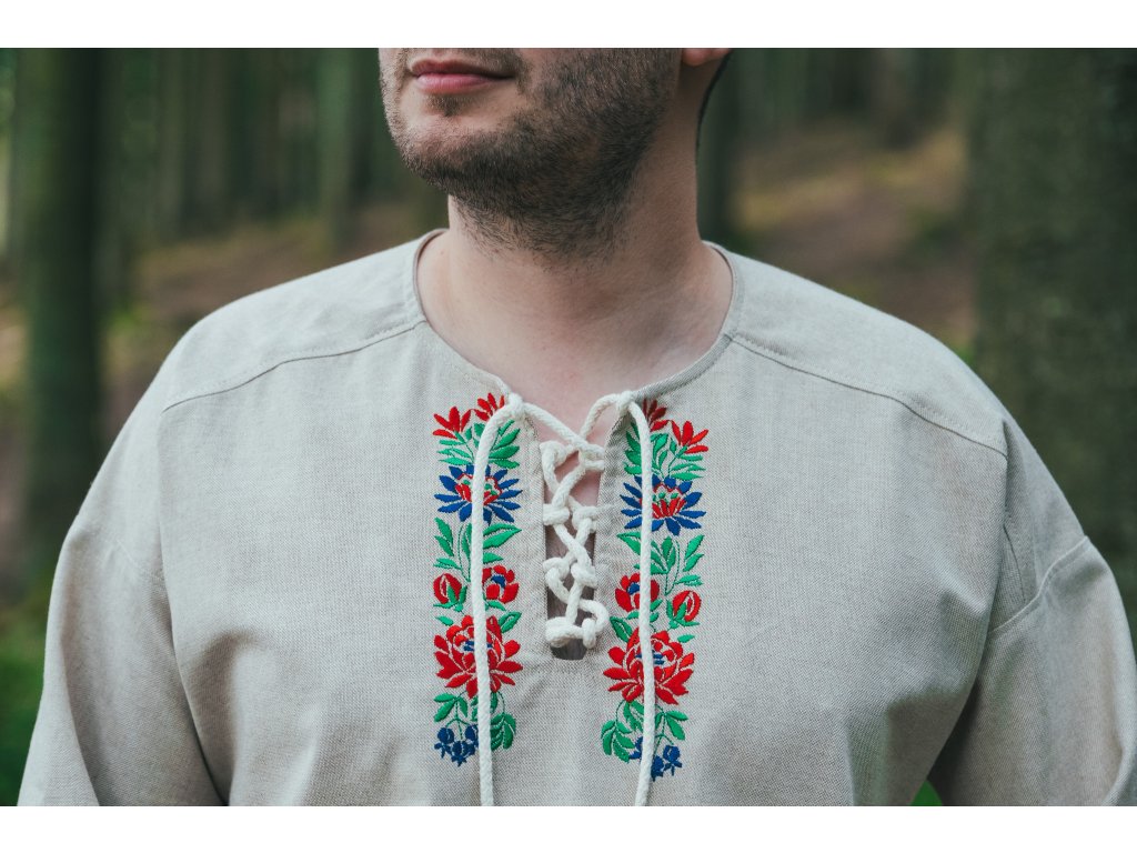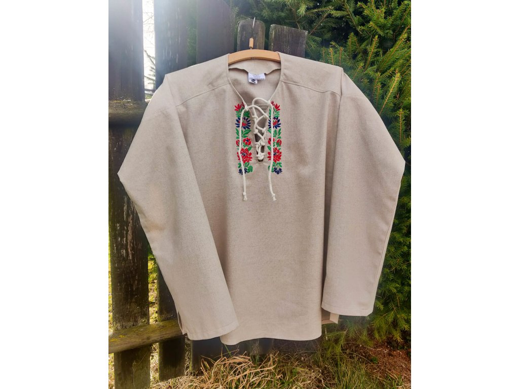 Pánska košeľa Kristián z režného plátna vo voľnom, pohodlnom štýle s viazaním na šnúrku, doplnená o folklórnu výšivku zo Slovenska.