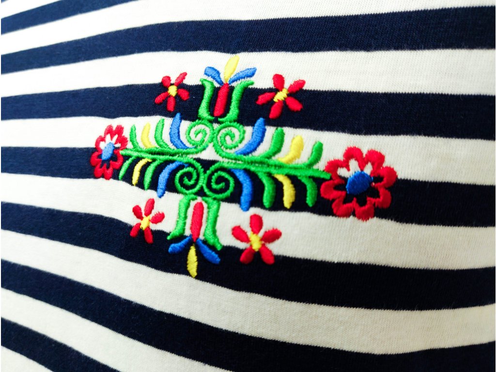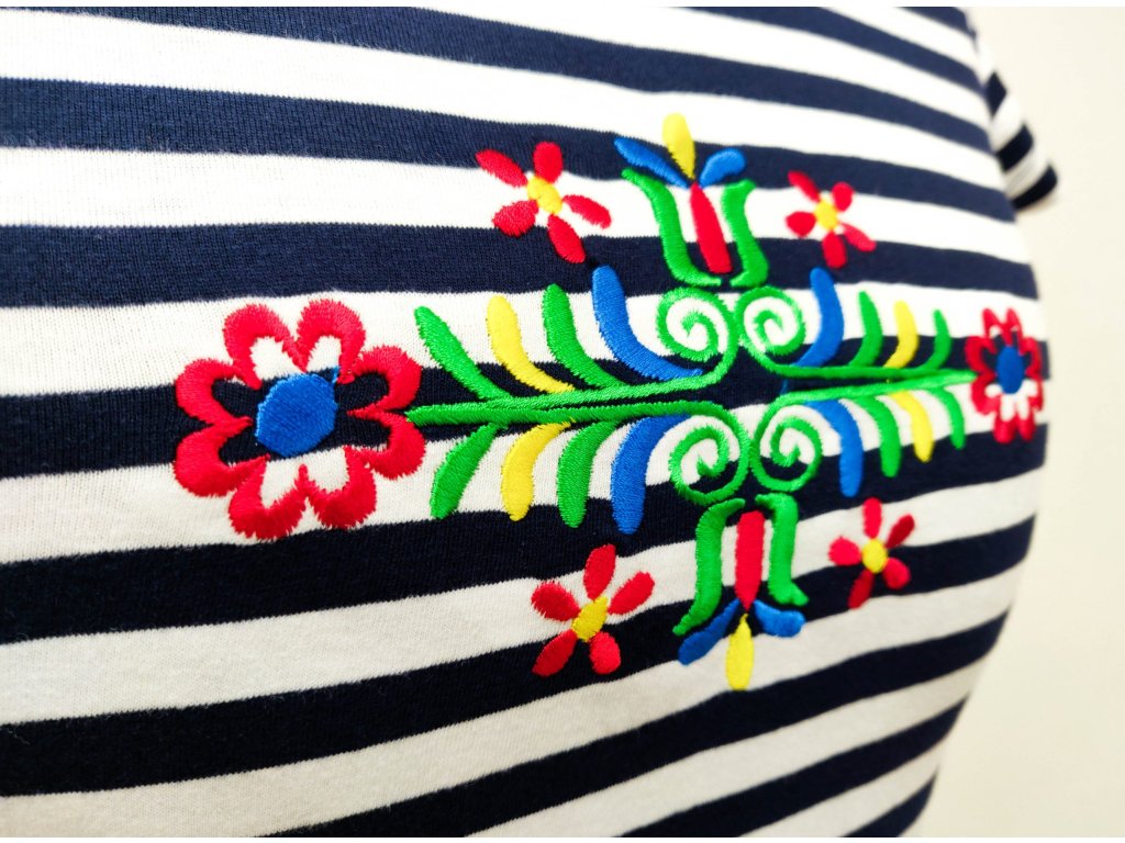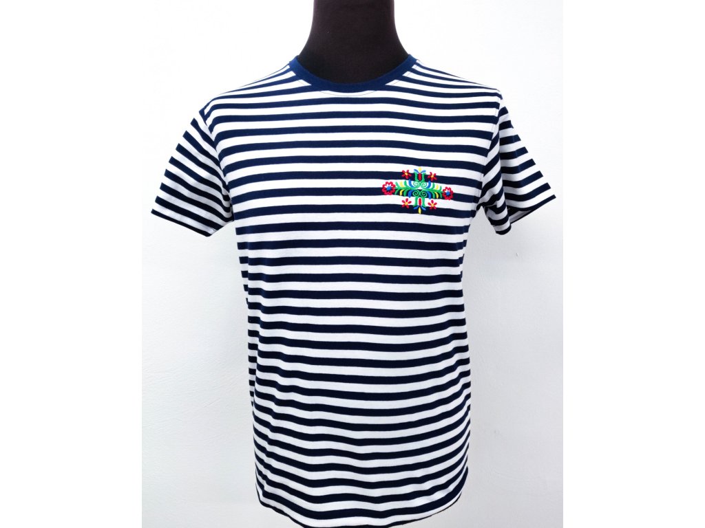 VYŠÍVANÉVyšívané tričko s folklórnym vzorom EVA s krátkym rukávom, pruhy v kombinácii biela a tmavomodrá
