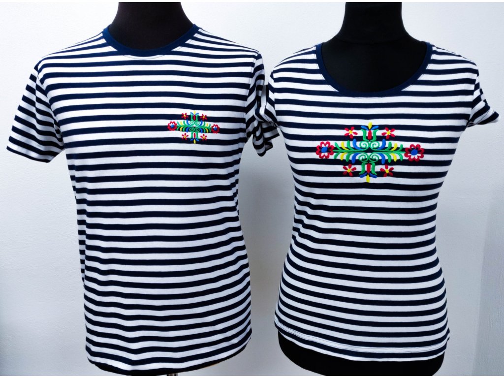 Sada vyšívaných tričiek s folklórnym vzorom EVA, pruhy v kombinácii biela a tmavomodrá