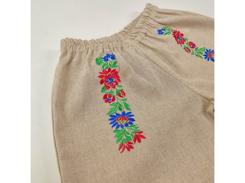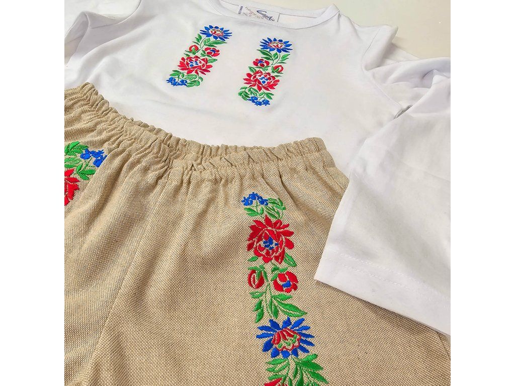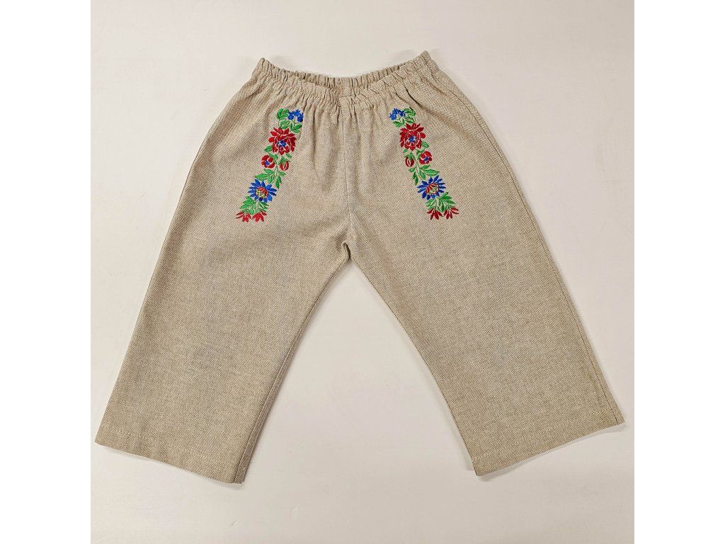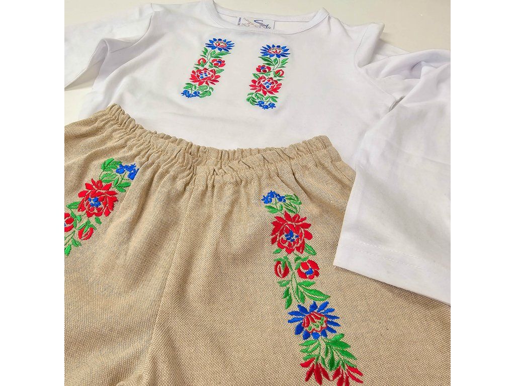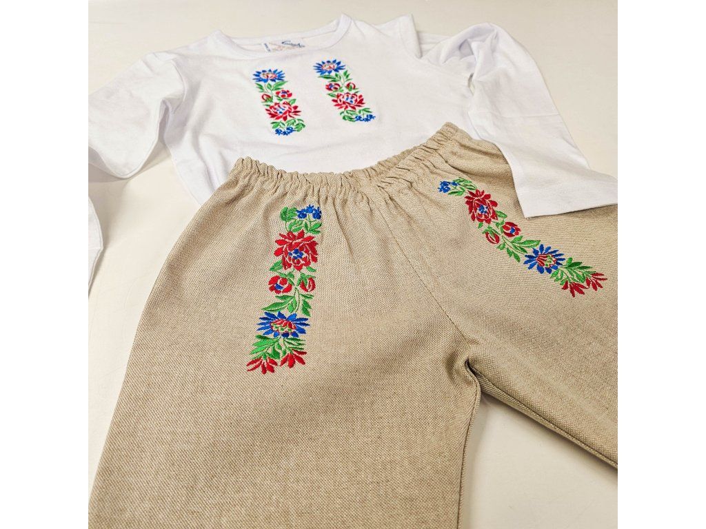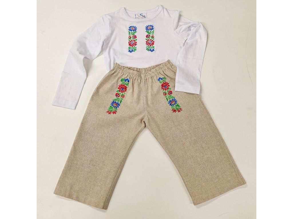 Sada detských vyšívaných nohavíc z režného plátna vo voľnom, pohodlnom štýle s gumou v páse a detského trička s dlhým rukávom doplnené o folklórnu výšivku.