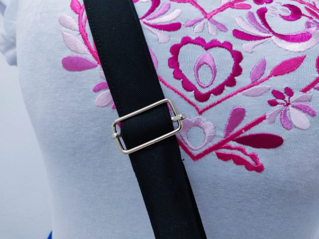 univerzálna kapsa v čiernej alebo tmavomodrej riflovej farbe s nastaviteľným popruhom a s vyšívaným vzorom inšpirovaný slovenským folklórom z oblasti západného Slovenska Vajnory, vhodná na nosenie cez rameno, uzatvára sa na zips. Vhodné pre pánov aj pre dámy.