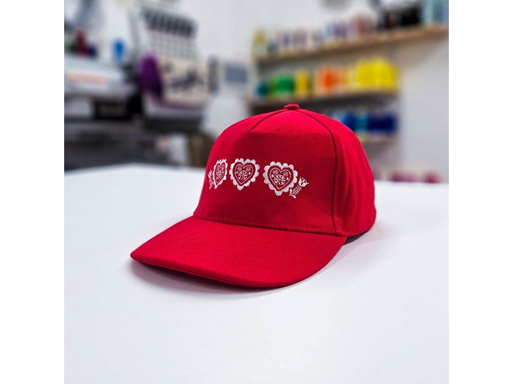 Elegantná červená šiltovka doplnená o originálnu výšivku troch srdiečok v bielej farbe.