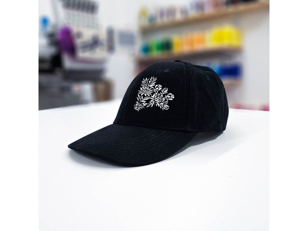 Elegantná čierna šiltovka doplnená o originálnu výšivku na prednej strane šiltovky inšpirovanou folklórom.