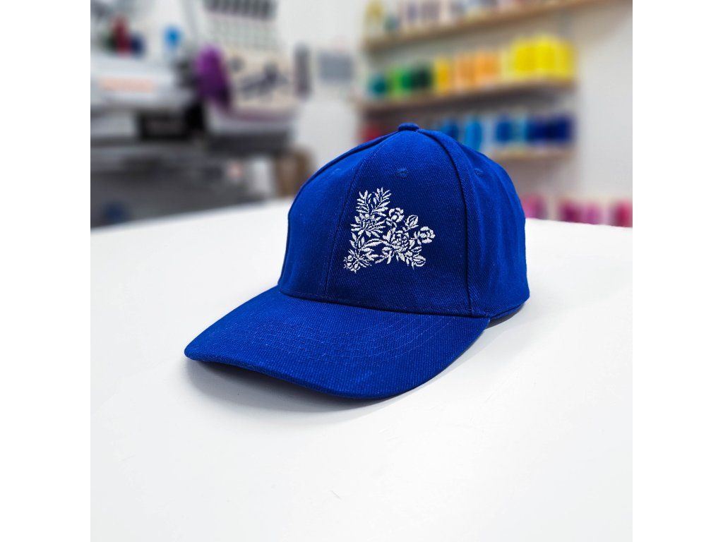 Elegantná modrá šiltovka doplnená o originálnu výšivku na prednej strane šiltovky inšpirovanou folklórom.