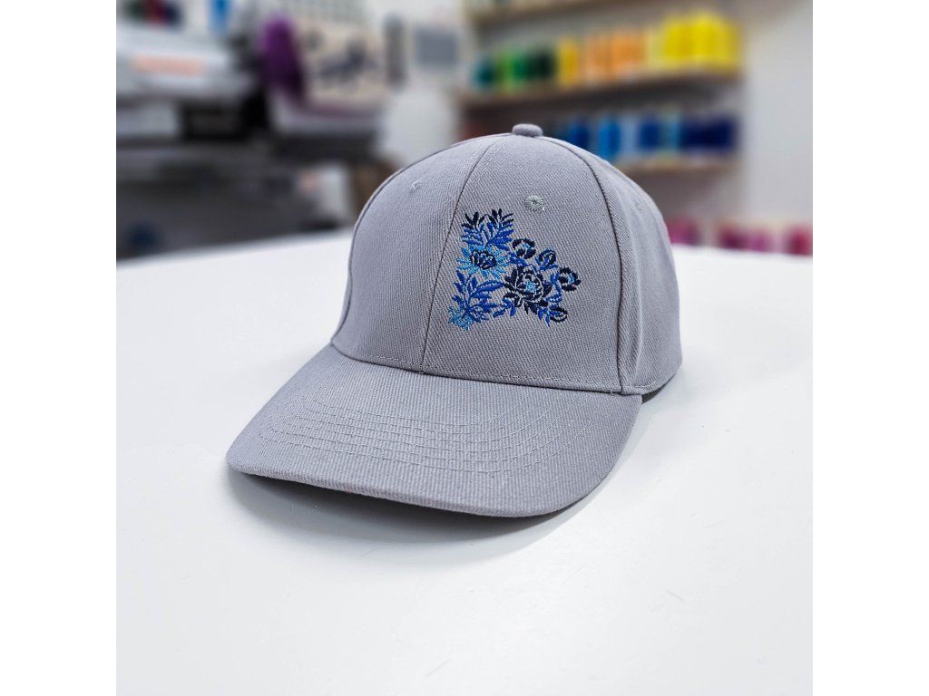 Elegantná strieborno sivá šiltovka doplnená o originálnu výšivku na prednej strane šiltovky inšpirovanou folklórom.