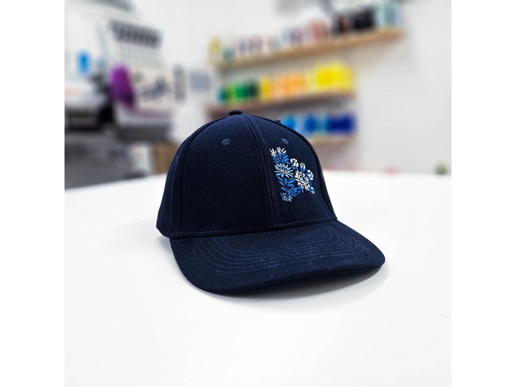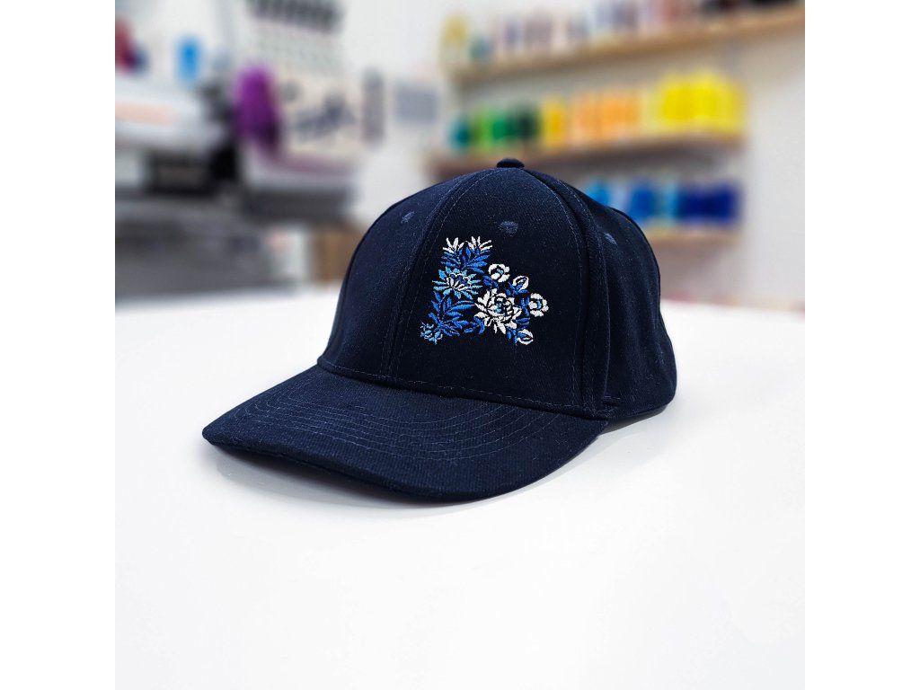 Elegantná tmavomodrá šiltovka doplnená o originálnu výšivku na prednej strane šiltovky inšpirovanou folklórom.