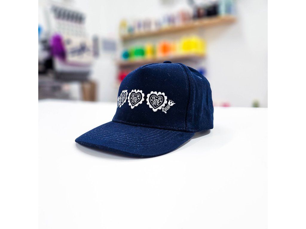 Elegantná tmavomodrá šiltovka doplnená o originálnu výšivku troch srdiečok v bielej farbe.