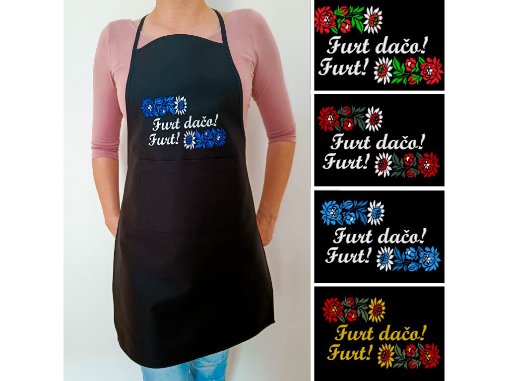 Vyšívaná zástera čierna ,,Furt dačo"