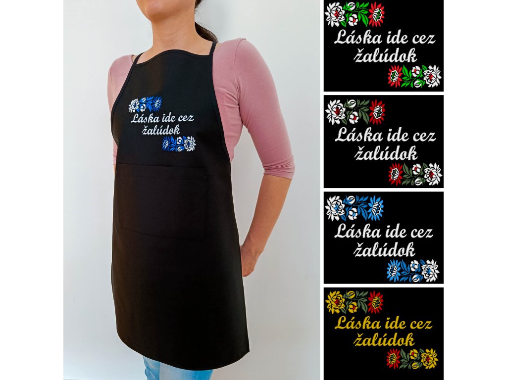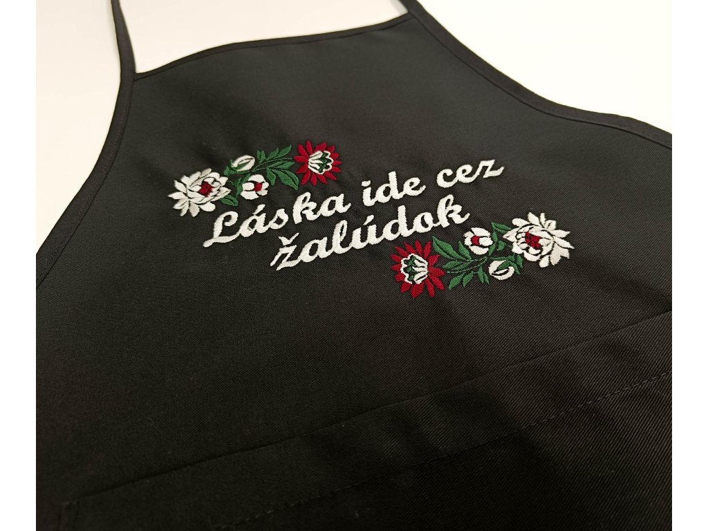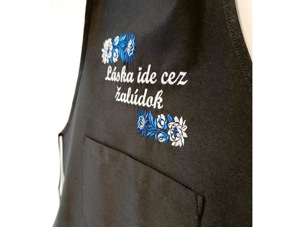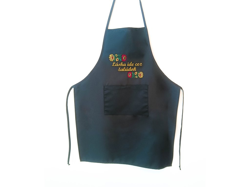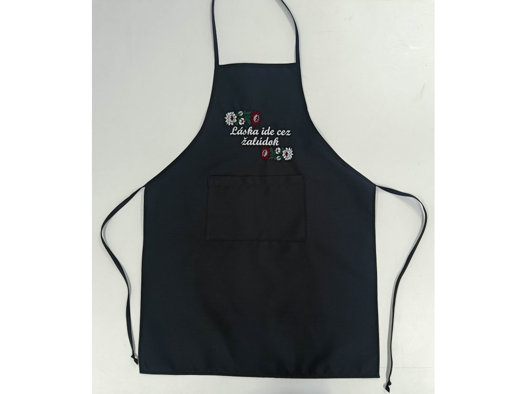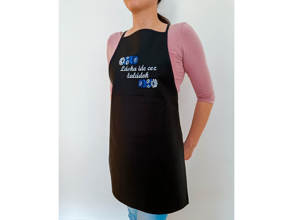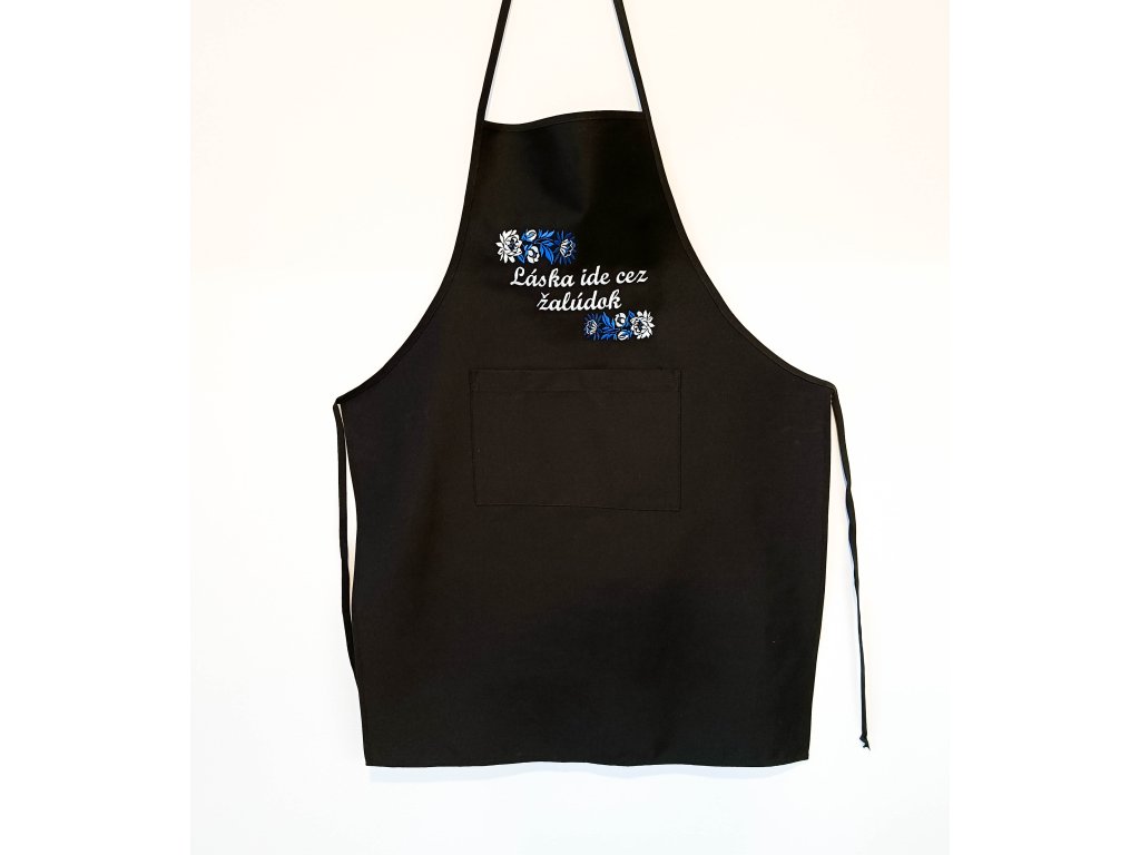 Čierna zástera s vreckom a výšivkou.
