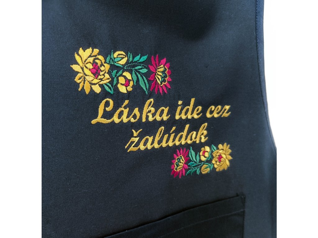 Zástera v čiernej farbe s praktickým vreckom, zdobená výšivkou folklórneho motívu a nápisu.