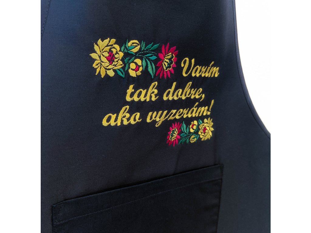 Zástera v čiernej farbe s vreckom, s VÝŠIVKOU nápisu a folklórneho motívu, s možnosťou pridať vlastné meno alebo text.