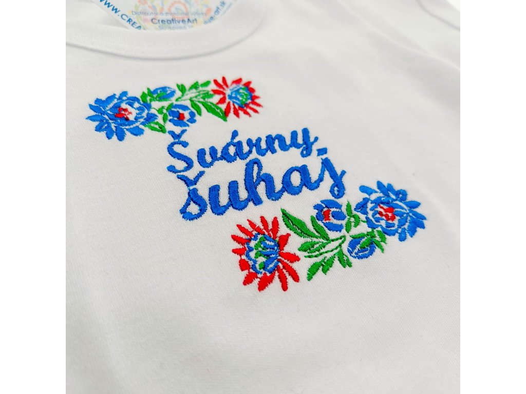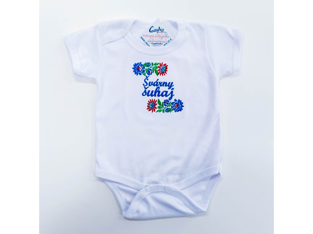Vyšívané detské rastúce body s výšivkou inšpirovanou slovenským folklórom a nápisom ,,Švárny šuhaj“ pre každého správneho malého folklóristu