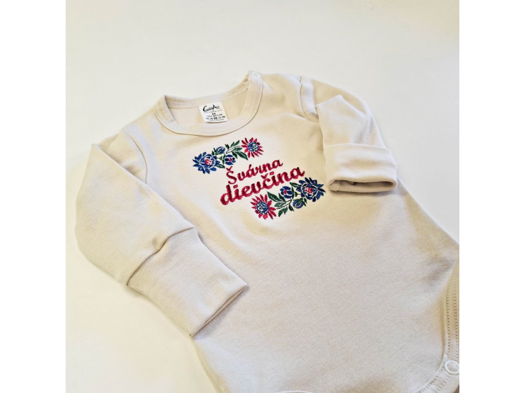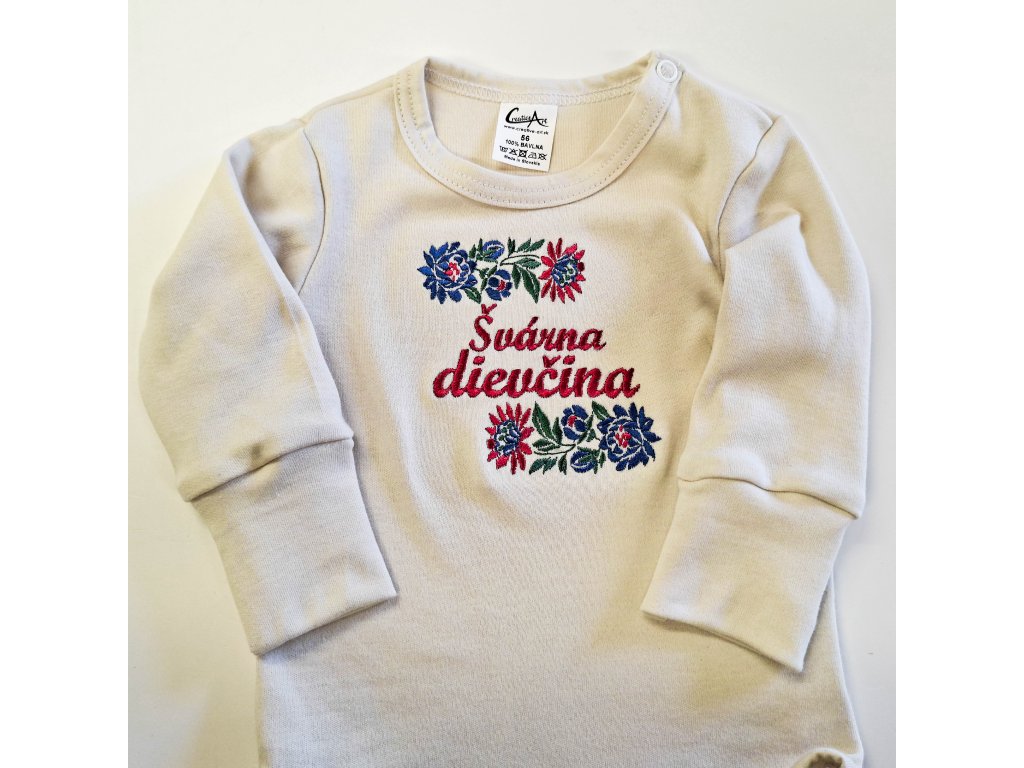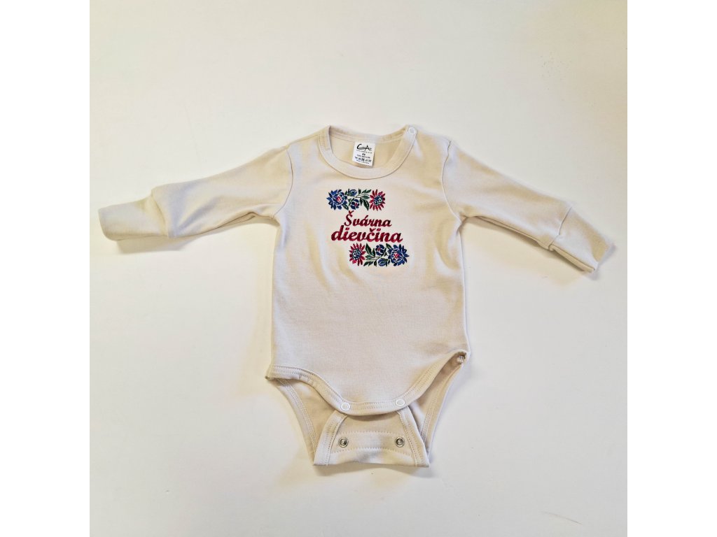 Vyšívané detské dupačky krémové s výšivkou ,,Švárna dievčina“ alebo vlastný text v cene Vyrobené na Slovensku z certifikovanej bavlny Zapínanie medzi nožičkami a na...