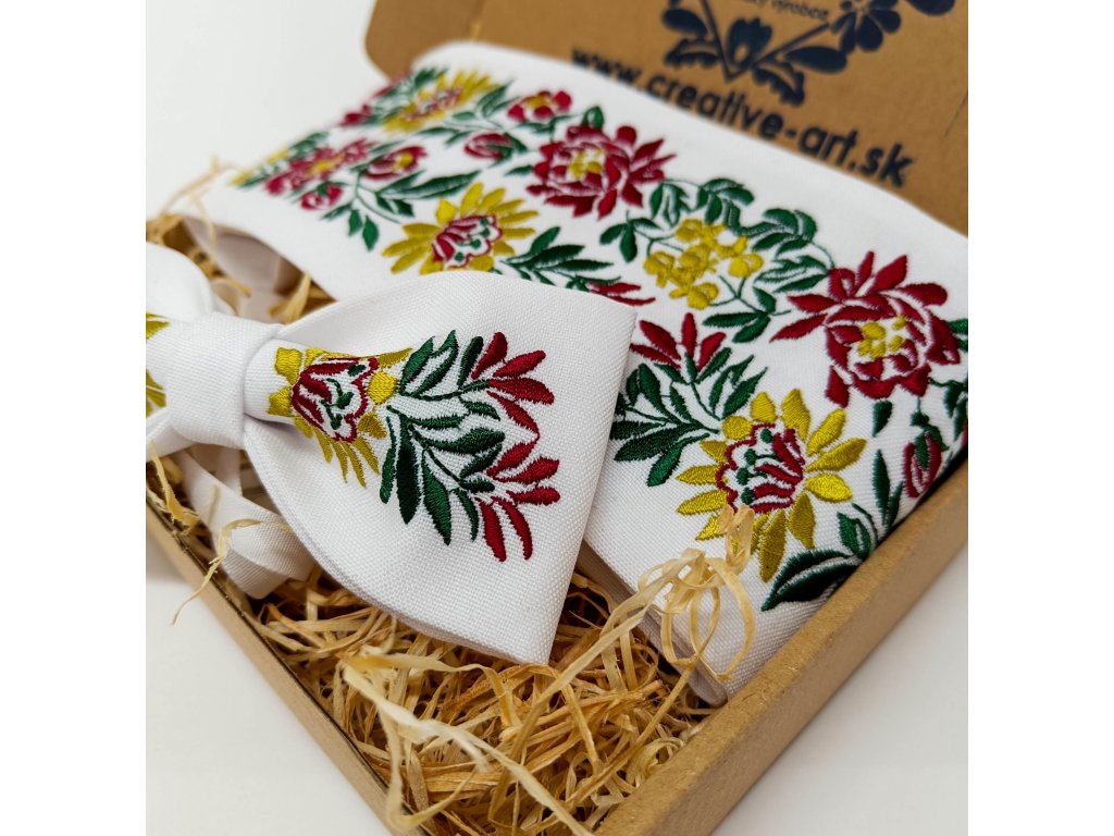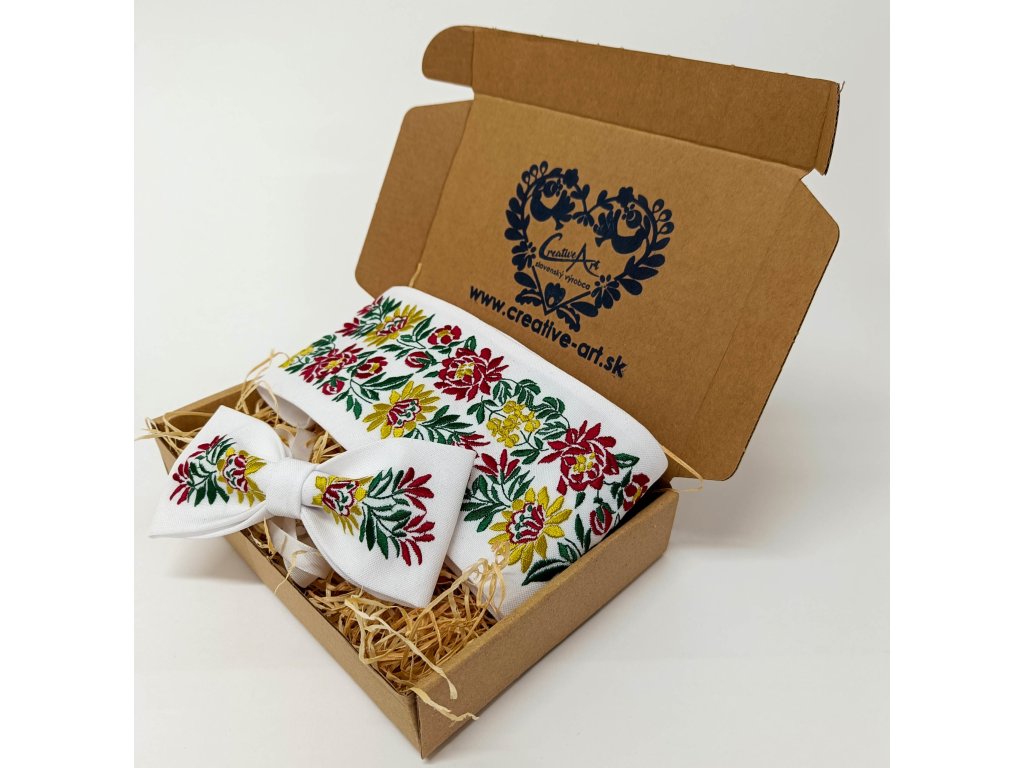 VYŠÍVANÉSada dámsky opasok a pánsky motýlik s vyšitým vzorom Adam v červeno žltých odtieňoch