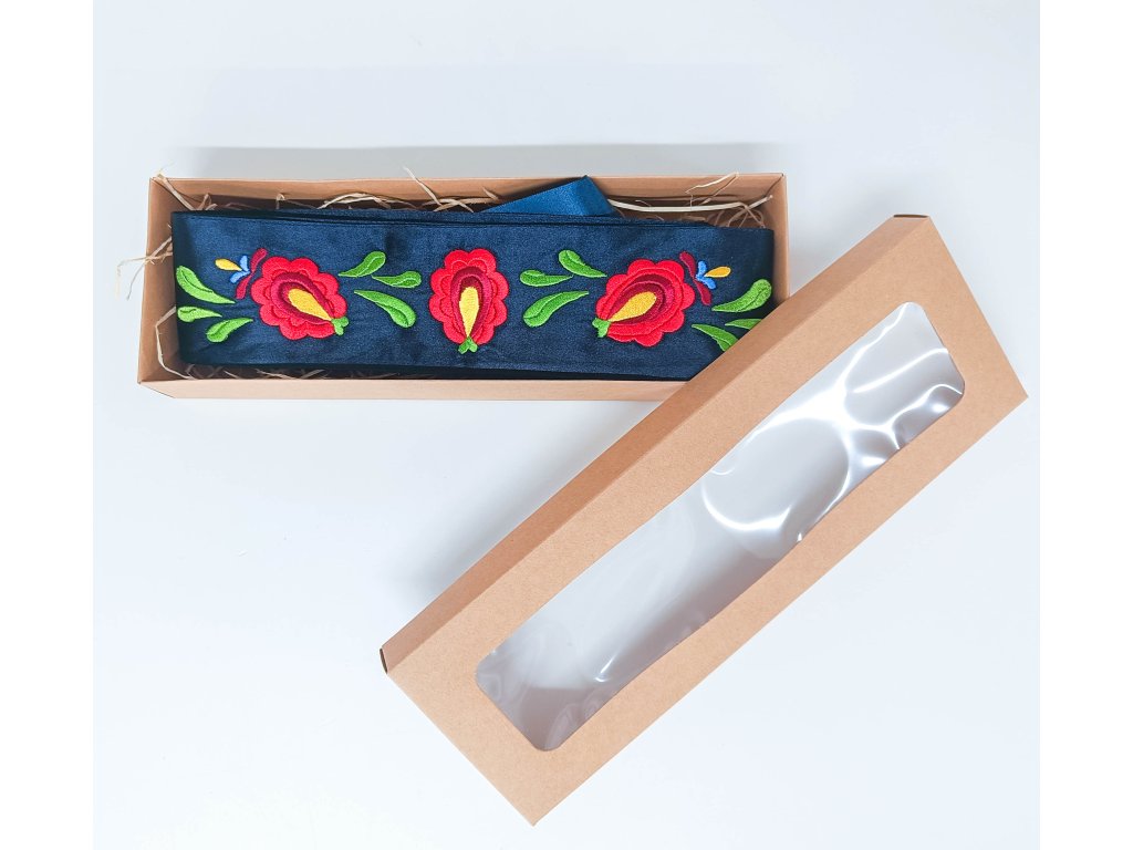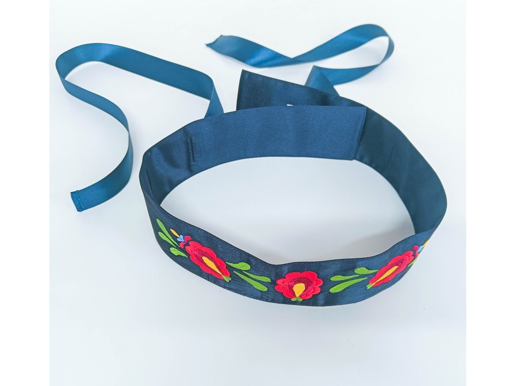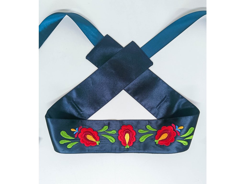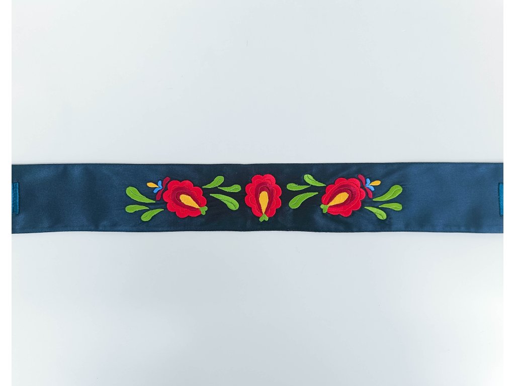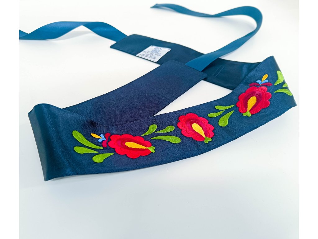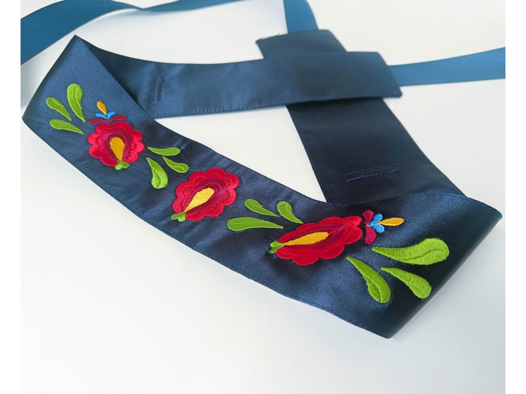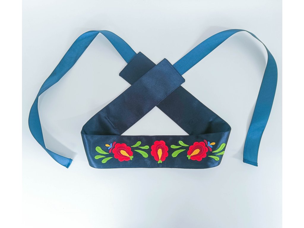 Dámsky opasok saténový tmavomodrý s folklórnou výšivkou vzor Goral, výšivka je inšpirovaná slovenským folklórom.